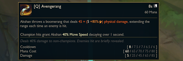 아크샨 스킬 상세 정보![]() ![]() 패시브 아크샨이 기본 공격 후 0.5ad의 피해량을 가진 기본 공격을 추가로 발사합니다. 아크샨이 추가 공격을 취소하면 대신 1초에 걸쳐 감소하는 40~85(아크샨 레벨 비례)의 이동속도를 얻습니다. 아크샨이 기본 공격이나 스킬로 한 대상을 3회 공격할 때마다 20~175(아크샨 레벨 비례)의 추가 마법 피해를 입히고 대상이 챔피언인 경우 아크샨이 2초간 유지되는 40~300 + 0.4 추가 ad만큼의 보호막을 얻습니다. 보호막 쿨타임 16~4(아크샨 레벨 비례)초 추가 공격은 미니언에게 1.0ad의 피해를 입히고 치명타 발동 시 피해량이 30% 증가합니다. 취소하여 얻는 이동속도는 자신의 공격속도에 비례해 증가합니다. ![]() Q 쿨타임 8/ 7.5/ 7/ 6.5/ 6초 마나 소모량 60/ 65/ 70/ 75/ 80 아크샨이 5/ 25/ 45/ 65/ 85 + 0.8AD의 물리피해를 입히는 부메랑을 던집니다. 적에게 적중할 때마다 사거리가 증가합니다. 챔피언에게 적중 시 1초에 걸쳐 감소하는 40%의 이동속도를 얻습니다. 챔피언이 아닌 대상에게 40%의 피해만 입힙니다. 적중당한 적은 잠시 위치가 드러납니다. ![]() W 쿨타임 18/ 14/ 10/ 6/ 2초 마나 소모량 40/ 30/ 20/ 10/ 0 지속 효과 : 아크샨의 아군을 처치한 적 챔피언들을 1분동안 악당 상태로 지정합니다. 아크샨이 악당 처치 관여 시 100 골드를 추가로 획득하고 해당 악당에게 처치당한 아군들을 즉시 부활시킨 후 다른 적 챔피언들에게 부여된 악당 상태를 제거합니다. 사용 효과 : 아크샨이 2초 혹은 벽이나 수풀에 인접한동안 영구히 지속되는 위장상태에 돌입합니다. 해당 상태에서 악당을 향해 이동할 때 80/ 90/ 100/ 110/ 120의 이동속도와 잃은 마나의 12%만큼 마나 재생을 얻습니다. 위장 상태가 유지되는 동안 아크샨에게는 악당을 향해 가는 경로가 표시됩니다. ![]() E 쿨타임 18/ 16.5/ 15/ 13.5 /12초 마나 소모량 70 처음 시전 시: 아크샨이 갈고리를 발사하여 처음 적중한 지형에 부착합니다. 두 번째 시전 시 : 아크샨이 해당 지형 주변을 원형으로 맴돌며 근접한 적에게 한 발당 (30/ 55/ 80/ 105/ 130 + 0.1 추가 공격력) X ( 1 + 0.3 추가 공격속도)의 피해를 입히는 사격을 지속적으로 가합니다. 세 번째 시전 시 : 아크샨이 밧줄에서 내려오며 최종 사격을 실시합니다. 도중에 적 챔피언이나 지형에 충돌 시 회전이 종료됩니다. 적 챔피언 처치 관여 시 이 스킬의 쿨타임이 초기화 됩니다. 해당 스킬의 사격은 패시브 중첩이 쌓인 적 챔피언을 우선으로 지정합니다. 해당 스킬의 사격은 적중 시 효과가 25%만큼 적용됩니다. ![]() R 쿨타임 100/ 85/ 70초 마나 소모량 100 아크샨이 적 챔피언을 조준한 뒤 최대 2.5초까지 총을 충전하여 충전 시간에 비례해 총알을 5/ 6/ 7발까지 장전합니다. 재사용 시 : 아크샨이 장전한 총알을 발사하여 처음 적중하는 적 혹은 구조물에 매 공격당 최소 20/ 25/ 30 + 0.1AD의 물리피해를 입힙니다. 피해량은 대상이 잃은 체력에 비례해 증가하여 최대 80/ 100/ 120 + 0.4AD까지 증가합니다. (4배) 총알은 미니언을 즉시 처치하며 생명력 흡수가 적용됩니다. 총알에는 치명타가 적용될 수 있으며 치명타 피해량이 50% 감소하여 적용됩니다.