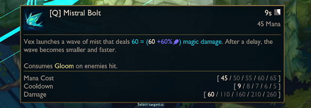 PBE 벡스 상세 정보![]() 스탯 기본 체력 : 520 성장 체력 : 90 기본 체력 재생력 : 6.5 성장 체력 재생력 : 0.12 기본 공격력 : 54 성장 공격력 : 2.75 기본 마나 : 490 성장 마나 : 32 기본 마법 저항력 : 28 성장 마법 저항력 : 0.5 기본 방어력 : 23 성장 방어력 : 3.25 성장 공격속도 : 1% 이동 속도 : 335 공격 사거리 : 550 ![]() 패시브 파멸과 우울 매 25~16초 (벡스 레벨 비례)마다 벡스가 파멸에 고통받는 상태가 되어 다음에 사용하는 기본 스킬이 대상의 이동기를 중단 시키고 0.75~1.5초 (벡스 레벨 비례)간 공포에 빠트립니다. 벡스 주변의 적들이 이동기를 사용하거나 순간이동기를 사용 할 경우 벡스가 대상 적들에게 6초간 우울 표식을 남깁니다. 벡스가 우울 표식이 남은 적에게 기본 공격을 가할 시 30~180 (벡스 레벨 비례) + 0.25AP의 추가 마법 피해를 입히고 파멸의 재사용 대기시간을 25% 감소시킵니다. 챔피언이 아닌 대상에게는 40~60%(벡스 레벨 비례)로 감소된 추가 피해를 입히며 파멸의 재사용 대기시간이 10% 감소합니다. 파멸 효과로 공포에 걸린 적들은 벡스로부터 멀어질 수록 이동속도가 더욱 느려집니다. ![]() Q 안개 화살 쿨타임 9/ 8/ 7/ 6/ 5초 마나 소모량 45/ 50/ 55/ 60/ 65 벡스가 전방으로 안개 파동을 발사해 60/ 110/ 160/ 210/ 260 + 0.6AP의 마법 피해를 입힙니다. 파동은 잠시 후 속도가 빨라지지만 폭이 좁아집니다. 적중한 적들의 우울 표식을 발동시킵니다. ![]() W 거리 두기 쿨타임 20/ 18/ 16/ 14 / 12초 마나 소모량 75 벡스가 2.5초간 유지되는 50/ 80/ 110/ 140/ 170 + 0.8AP의 보호막을 얻고 주변 적들에게 80/ 120/ 160/ 200/ 240 + 0.3AP의 마법 피해를 입힙니다. 적중한 적들의 우울 표식을 발동시킵니다. ![]() E 커지는 어둠 쿨타임 13초 마나 소모량 70 벡스가 지정 위치로 날아가며 커지는 그림자를 날려보냅니다. 그림자가 지정 위치에 도착 시 범위 내 적들에게 50/ 70/ 90/ 110/ 130 + 0.4 / 0.45 / 0.5/ 0.55/ 0.6 AP 의 마법 피해를 입히고 2초 동안 30/ 35/ 40/ 45/ 50% 둔화시킵니다. 적중한 적들에게 우울 표식을 남깁니다. ![]() R 그림자 파동 쿨타임 140/ 120/ 100초 마나 소모량 100 급격히 달려나가는 그림자를 내보내 처음 적중한 적 챔피언에게 75/ 125/ 175 + 0.2AP의 마법 피해를 입히고 4초동안 표식을 남깁니다. 재사용 시 : 표식이 남은 적 챔피언에게 달려들어 도착 후 150/ 250/ 350 + 0.5AP의 마법 피해를 입힙니다. 이 스킬로 6초 안에 피해를 입었던 챔피언이 사망한 경우 잠시 동안 이 스킬의 쿨타임이 초기화 됩니다. 사거리 2000/ 2500/ 3000