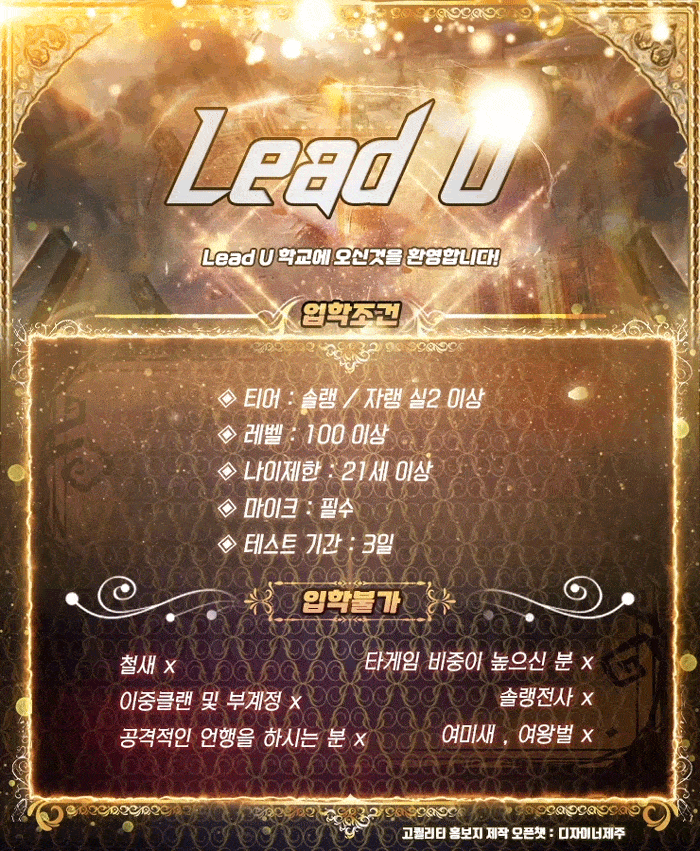 [친목/성인/닉변] 새롭게 단장한 Lu 클랜 신입생모집 中![]() 1. Lead U 학교는 어떤 곳인가요? - 2019년 1월에 개설한 친목 중심 클랜입니다. 곧 2주년을 앞두고 있고 최근 리뉴얼을 하여, 약 35명의 학생들이 함께 하고 있습니다. 학생들의 티어 분포는 다이아 10% 플래티넘 50% 골드 40% 정도 분포중입니다. 2. 어떤 사람이 입학할 수 없나요? - 21세 미만에 학생분, 디스코드 마이크 사용이 안 되시는 분 (전시즌 현시즌) 실버2 미만, 100레벨 미만에 학생분 이중클랜 , 철새 , 부계정이신분 들도 당연히 입학을 할 수 없습니다. 3. 어떤 학생들이 함께 하나요? - 다양한 연령대에 학생분들이 함께하고 있습니다. 30대 10% 20대 초반 40% 중후반 45% 정도 분포중입니다. 나이대가 나뉘어있다고 해서, 적응하시기 어렵다거나 친해지기 어렵지 않습니다. 4. 테스트 기간이 왜 5일 인가요? - 저희 학교는 테스트 기간이 5일 동안 이루어집니다. 다른 곳에 비해 현저히 적은 기간이지만, 이 기간 내에 선생님들이 최대한 집중적으로 신입생분들이 잘 적응하실 수 있도록 이끌 수 있다고 생각합니다. 다만 테스트 기간 이후 신입생분의 의지가 없다면 적응이 어려울 수도 있습니다. 더 궁금한 사항이 있으시다면, 아래 링크를 통하여 선생님들과 상담이 가능합니다. http://pf.kakao.com/_NnxkBxb