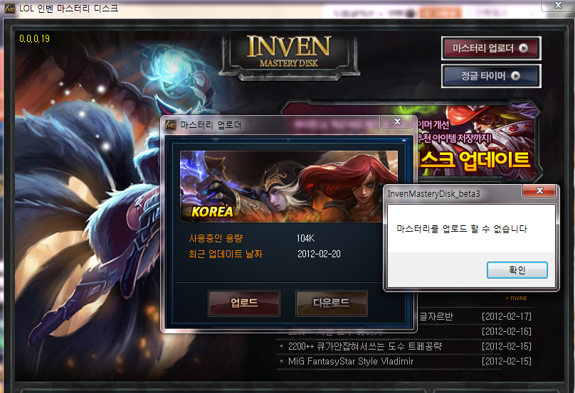 업로드가 안되요.(사진첨부)롤을켜고 업로더를 눌러 업로드를 하려는데 "마스터리를 업로드 할수없습니다."라고 나옵니다. 다운로드도 마찬가지고요. 용량도 다 나와있는데 누르면 안되네요. 정확한 해결방법좀 알려주세요. ![]()