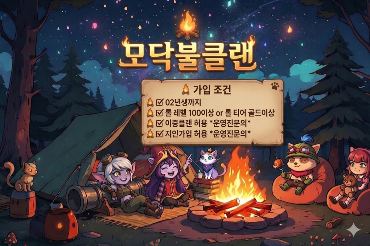 [롤/종겜] 텃세 없는 수평적 클랜 ෆ 전라인 환영 ෆ![]() "우리는 모두 동등한 게이머"수직적인 텃세나 스트레스 없이,수평적이고 편안한 분위기에서 다 같이 즐겁게 오래 함께하실 분들을 환영합니다!🔥클랜 특징 🔥 메인 게임 : 리그 오브 레전드 (솔/듀오 보다는 자랭, 내전 위주) 🔥 종합 게임 : 서든어택, 배틀그라운드, 스팀 게임 등 다양하게 취급 🔥 수직적인 꼰대 문화 NO! 모두가 동등한 수평적인 관계 지향 🔥 맞춤형 투트랙 톡방 시스템 (모닥불은 두 개의 오픈 카톡방으로 나뉘어 운영됩니다) 🔥 수다방 : 일상 생활 공유, 텐션이 높고 북적북적한 친목 분위기 🔥 구인구직방 : 오직 게임 인원 구인/구직 전용 (자랭, 내전, 종겜 위주) 🔥 수다방의 높은 텐션이 부담스러우시다면 구인구직방만 가입하셔도 무방합니다. 🔥가입 조건 🔥 나이 : 90년생 ~ 02년생 까지 🔥 롤 조건 : 레벨 100 이상 또는 티어 골드 이상 (둘 중 하나만 충족 시 가입 가능) 🔥 가입 및 기타 안내 🔥 이중클랜 허용 (특수한 조건이 포함되어 있습니다. 운영진 문의) 🔥 지인가입 가능 (운영진 문의) 자세한 사항은 들어오셔서 편하게 문의해 주시면 친절히 안내해 드리겠습니다!https://open.kakao.com/o/gqF7bsii