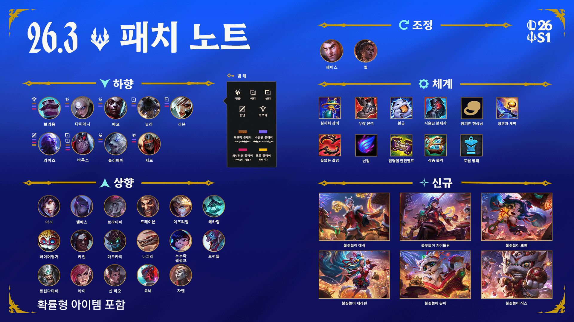 난입이 최상위권 실력대 게임에서 중단 공격로 챔피언 다양성을 저해한다고 판단했습니다. 원거리 챔피언이 난입을 너무 쉽게 발동시킬 수 있어 대부분의 공격로 개입이나 근접 챔피언으로부터 벗어나게 해 주기 때문입니다. 난입을 주로 사용하는 오리아나, 블라디미르, 탈리야는 다른 선택지가 충분합니다. 전반적으로 성적이 훌륭하며 이번 패치에서 실체화 장비도 상향되는 라이즈의 경우 이 변경 사항이 직접적인 위력 하향으로 작용하기를 바랍니다. 궁극적으로 원거리 챔피언에 한해 위력을 하향하고 근접 챔피언이 소규모 교전이나 난전 상황을 날렵하게 헤쳐 나가게 해 주는 능력은 유지하고자 합니다.