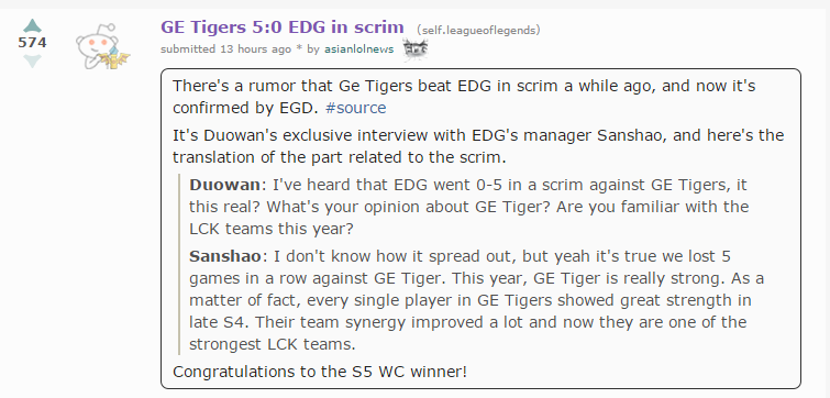EDG, GE에게 스크림 0:5패배![]() EDG가 GE에게 0:5로 스크림에서 무참히 패배했다? 라는 루머가있었는데 EDG매니저가 직접 밝혔네요. 패배를한것이맞고 지금의 GE는 정말강력하고 팀원간의 시너지가 대단하다고합니다. 레딧에선 어느정도 예상했다는 반응들이 대다수네요 ![]() ↑ 영원히 고통받는 우지 반면에 폰과 데프트를 영입하며 기세등등하던 중국커뮤니티는 충격에빠진것같습니다. 단지 시즌전 스크림이라 무조건 폰과 데프트가 플레이를했을지는 잘 모르겠네요. ![]() ↑인터뷰 중국어 원문