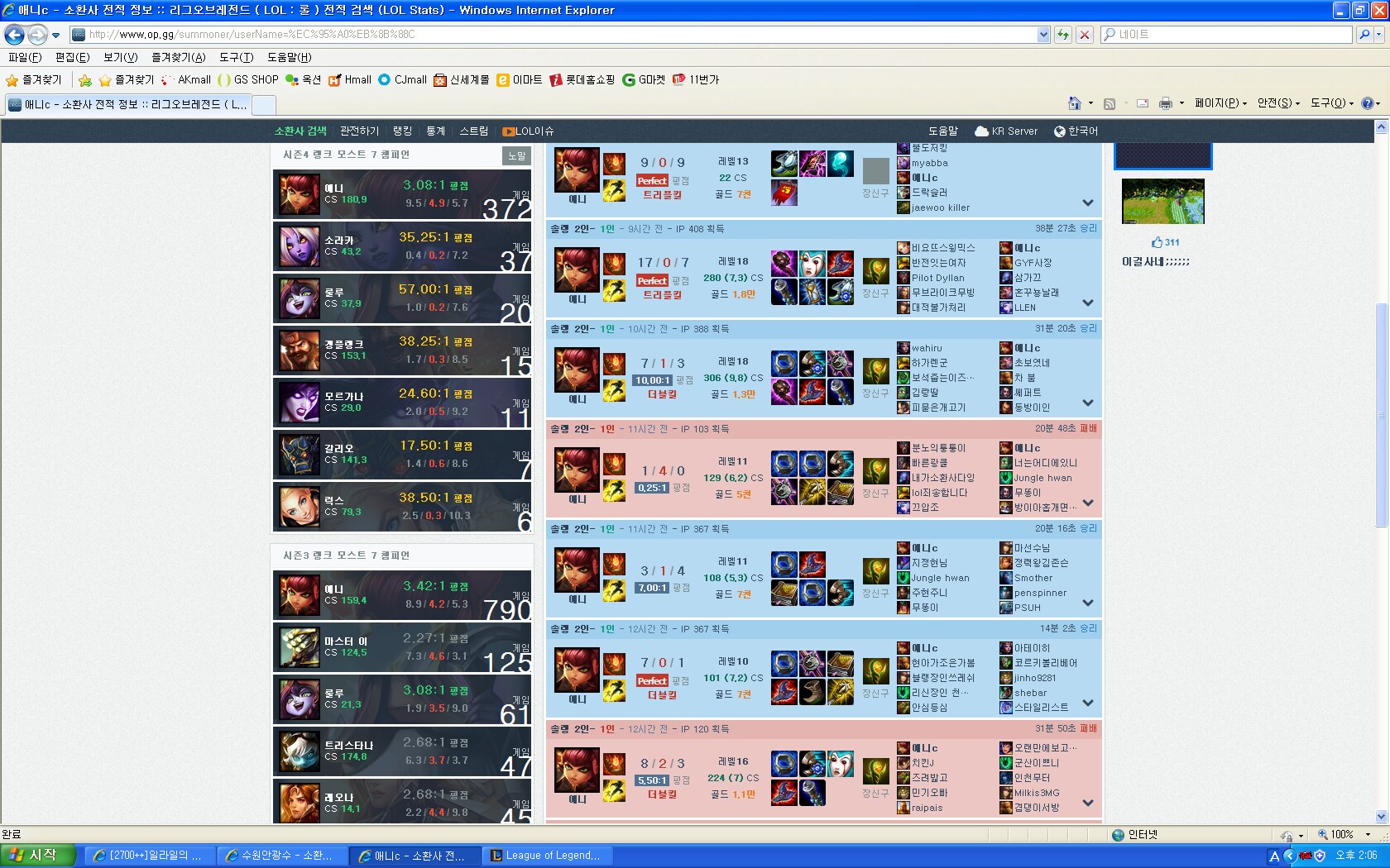 랭겜에서 저런 평점낼려면 도대체 게임을 어떻게 하는거져?ㄷㄷ;; 골드 승급전에서 만났는데 울편1픽이 미드골랏는데도 아무말안하고 애니픽 고르길래 전적검색해보니...ㄷㄷ 하더군여.ㅡㅡ;;