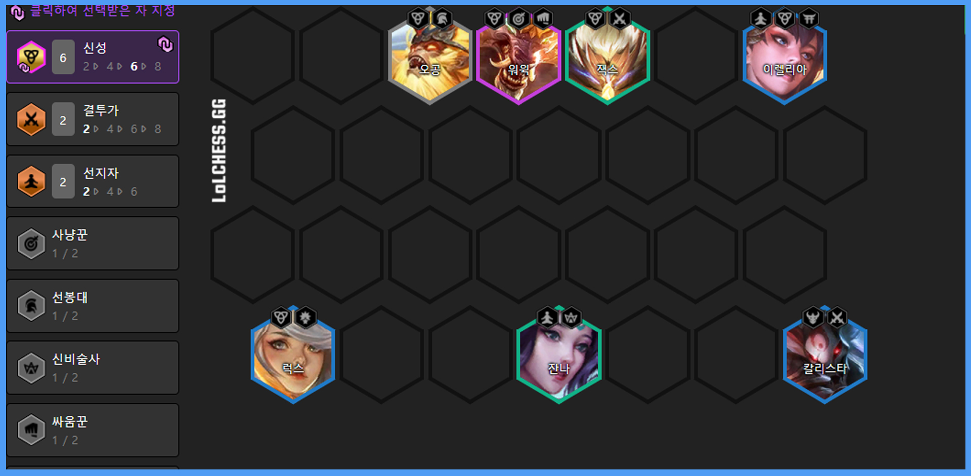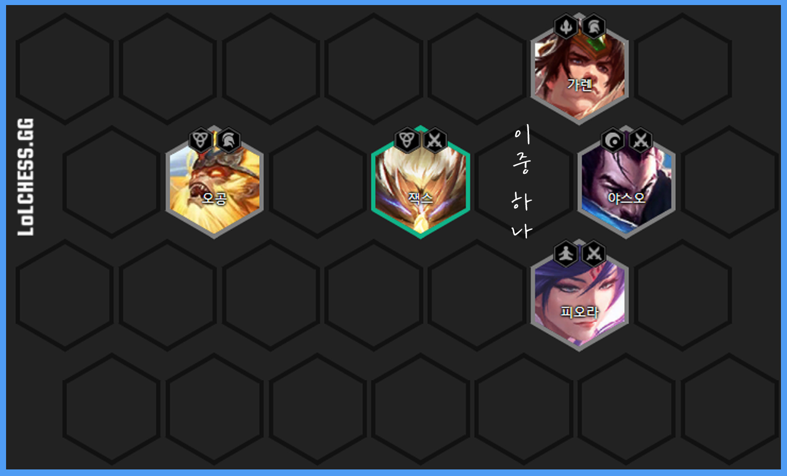 그래서 오공의 공속과 신성 유닛들의 공속을 올려줌으로써 게임을 최대한 빠르게 끝낼 수 있게 만들어 줍니다. 3. 초반 빌드업 초반 빌드업은 신성과 결투가 또는 신성과 선봉대로 빌드업하는 것이 가장 베스트 입니다. 저번 영상에서 이야기 한 거처럼 선봉대의 시너지가 버프를 받기도 하고 신성과 결투가는 여전히 초반에 강한 면모를 보여주고 있기 때문입니다. 그래서 3렙기준 빌드업은 오공 잭스 or 가렌,야스오,피오라 정도라고 생각하시면 편하실 겁니다!
