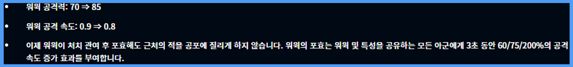 하지만 곡궁 3개와 BF 2개는 상당히 모으기 힘들어서 3신기 중 몇개를 변형해도 좋습니다. 죽검과 비슷한 인피를 줘도 좋고 또는 라위나 피바라기를 줘도 밥값을 합니다! 그리고 루난 대신 구인수를 주는 방법도 있고 뒤집개가 뜬다면 결투가 쪽으로 방향을 돌려서 플레이해도 좋습니다! 대신 오공 원툴로 간다면 초반 캐리력을 제외한다면 다른 시너지 보다 상당히 떨어져 다른 유닛을 활용하는 것이 좋은데 바로 워윅입니다. 워윅는 저번 패치에 리워크를 하여 공포대신 공속을 올려주는 메커니즘을 가지고 있습니다.