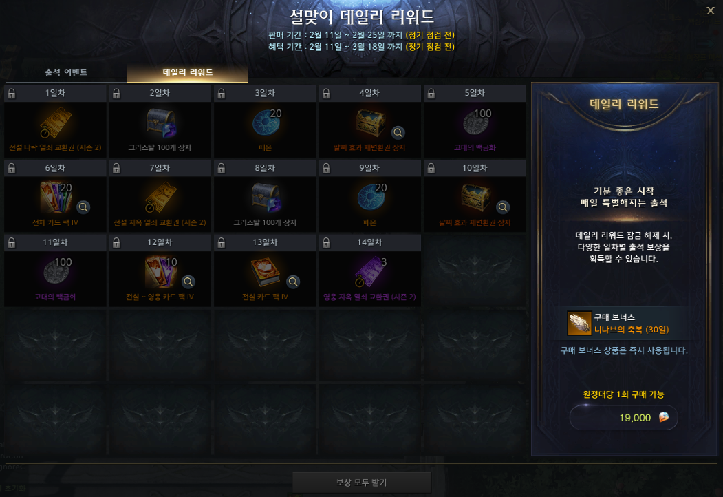 혜택 기간은 데일리 리워드 구매 후 출석을 통해 보상을 획득할 수 있는 기간입니다.