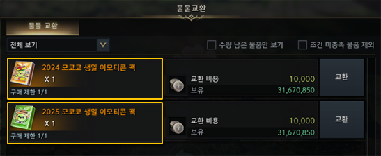 2025 모코코 생일 이모티콘 팩 ※ 각 이모티콘 팩은 원정대 단위로 1회 구매 가능하며, 이미 각 이모티콘 팩 또는 대상 이모티콘을 보유하고 있는 경우에는 추가로 구매할 수 없습니다. ※ NPC '루이루이'는 4/29(수) 정기 점검 전까지 만나보실 수 있습니다.