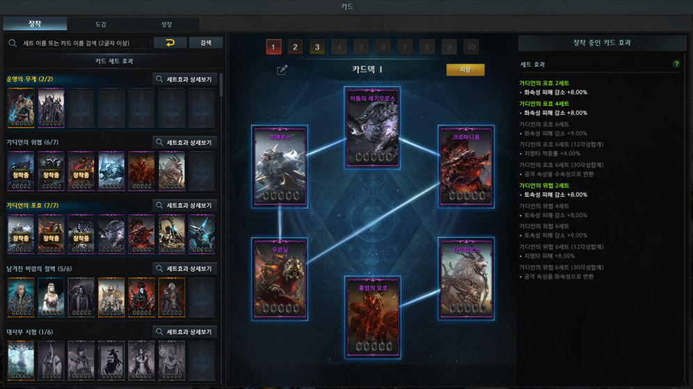 - 세트 장착 효과: 세트 별 분류된 카드를 수집해 카드 덱에 일정 수 이상 장착하여 효과를 얻습니다.