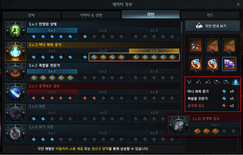 - 각인 활성 포인트를 5포인트 수집할 때마다 각인 레벨이 상승합니다.