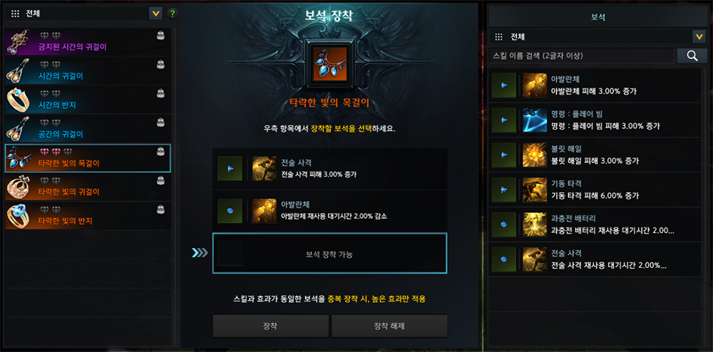 티어 2 이상 구간의 장신구 아이템에 보석을 장착하여 전투 스킬을 강화할 수 있습니다.