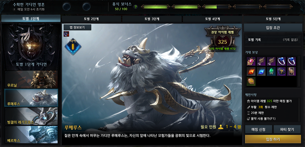 - 2단계 이상의 토벌에 도전하려면 일정 수준의 아이템 레벨 달성 및 이전 단계 토벌을 모두 완료해야 합니다.