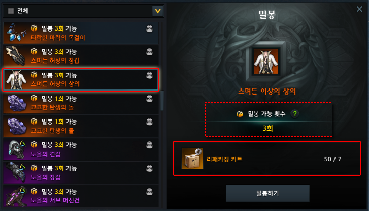 ※ 밀봉은 아이템 당 최대 3회만 진행할 수 있습니다.