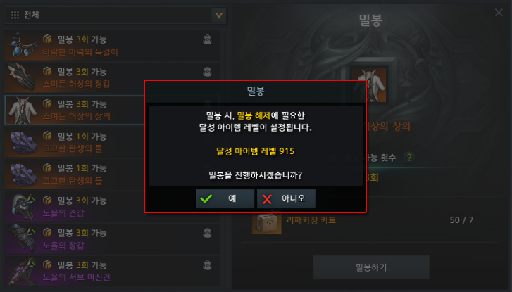 ▲ 밀봉하는 아이템에 따른 아이템 레벨 설정 및 안내 사항이 출력됩니다.