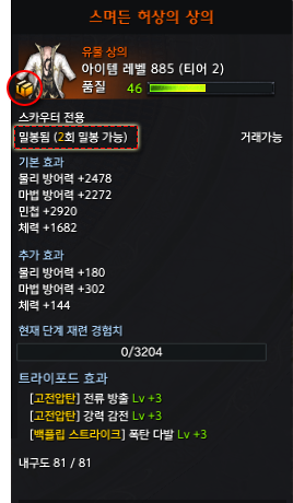 밀봉은 최대 3회까지 진행할 수 있으며, 밀봉 이력에 따라 가능 횟수가 상이합니다. - 아이템을 밀봉하기 위해서는 별도의 재료 아이템이 필요합니다.