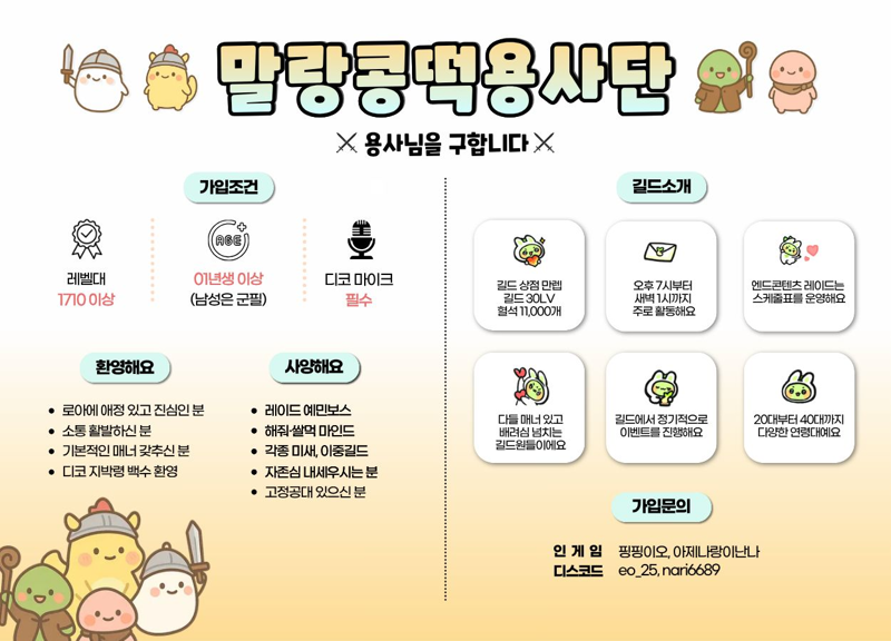 친목길드 ❄️말랑콩떡용사단❄️에서 길드원 모집합니다![]() 🍮친목길드 <말랑콩떡용사단>에서 길드원 모집합니다🍮 디코에서 친목다지며 같이 숙제하실 분 환영합니다! 길드 내 파티는 종막,4막하드 이외 레이드는 길드내에서 모바출! 길드원 주 접속시간 : 직장인 다수(평일 저녁7시~새벽 1시) 🍮가입조건 🔹1710↑ 이상 / 평균레벨 1730+ 🔹01년생 이상 (남성은 군필) 🔹길드 디스코드 참여 필수(마이크 필수) 🔸사사게스타,여,남미새,해줘마인드는 죄송합니다 🍮 문의 디스코드: eo_25 , nari6689 / 인게임 핑핑이오 , 아제나랑이난나