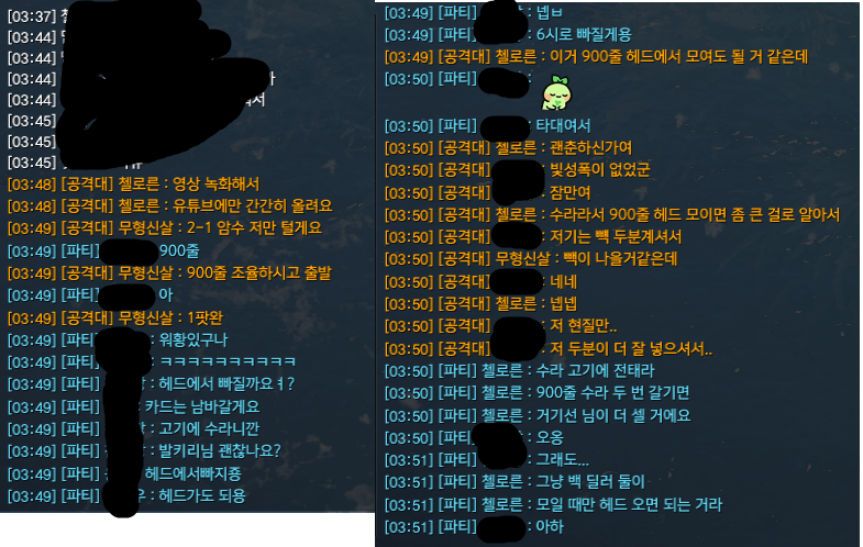 무형신살님, 심군이 기싸움 했다고 오해하실까봐서 블박까요.![]() 영상 녹화되기 전의 대화입니다. 유튜브에 올린다라는 말이 나온 건, 출발하기 전에 무형신살 행님께서 "2팟 워로드님. 방송인이에요?" 하시길래 대답했어요. 일단 제 모든 행동들이 꺼드럭처럼 느끼셨다면 죄송합니다. 더퍼 가는 거 자체를 좋아해서 많이 다니는 편입니다. 저도 심군 칭호 달고 이것저것 꺼드럭거리거나 하는 사람들 많이 봐와서 그렇게 저렴하게 행동하는 거 싫어해요. 그래서 공팟에선 최대한 말 조심하는 편입니다. 먼저 깬게 대수는 아니니까용. 다만 조합 봤을 때 1파티 오의, 잔재, 전태. 2파티 수라, 고기, 딜키리였고, 900줄 때 수라가 워로드 1각 받고 딜 밀면 그게 크게 유의미하다는 걸 들어서 헤드에서 모여도 될 것 같은데 괜춘하신가요 하고 의견을 여쭤봤을 뿐입니다. 빽이 나을 것 같다셔서 그냥 두말 않고 알겠다고 했습니다. 강압적으로 굴지도, 흔한 꺼드럭들처럼 흠 ㅋㅋ 일단 넵 알겠습니다 ^^ 같은 거 없이 그냥.. 넵넵! 그리고 뭐 출발할 때 조우 헤드만 잡고 백 잡아달라는 정도? 이건 항상 트라이때마다 늘 요구해왔던 건데, 고기다보니 조우 사이클이 너무 중요해서 조우 첫 돌진 패턴이 백으로 튀어버리면 사이클이 아예 망가져버려서 늘 공대원들에게 양해를 구해왔던 부분이에여. 애초에 백딜러들 입장에서도 헤드가 잡힌 뒤에 포지셔닝을 해야 사이클에 망가짐이 없을 거고, 특히 고기보다 더 치명적인 게 수라거든요. 암튼 뭐 각설하고, 그렇게 1트가 시작됐는데 900줄에서 같은 파티원 분들이 백으로 이동하시지 않아 백 포지션 잡고 있던 사람들이 주변똥에 감전 댄스를 추셨습니다. 백으로 모이라고 했는데 왜 그러는 거에요? 라며 공대장이 중단을 박으셨습니다. 사실 공대장 입장에서 조율 해놓은 거 안 지켜서 빡칠만은 한데, 막차 시간에 같은 성불자끼리 실수 한 번 하지고 너무 박하다 싶어 나름 커버좀 쳐줄라고 '아 진짜 그거 때문에 리트 하신거구나' 라고 했는데. 뭐 와서 꺼드럭거릴거면 공대장 니가 잡지 그러냐 이런 반응을 하셔서 그제서야 아차 싶더라고요. 백으로 모이자는 말을 거부하고 헤드에서 기싸움 한 걸로 오해하셨구나 싶었습니다. 그래서 블랙박스 오픈 하는 겁니다. 무형신살님, 모쪼록 성불 하시길 바라며 암튼 저는 실수하지도, 기싸움 하지도 않았습니다... 예... 사실 채팅창 보면 알겠지만, 우리 파티 사람들한테 백으로 합의했는데 왜 안 오냐고 말할려고도 했었습니다. 근데 꺼드럭거리는 것처럼 보일까봐 말을 아꼈고요. 암턴 그렇습니다. ^^ㅣ발.