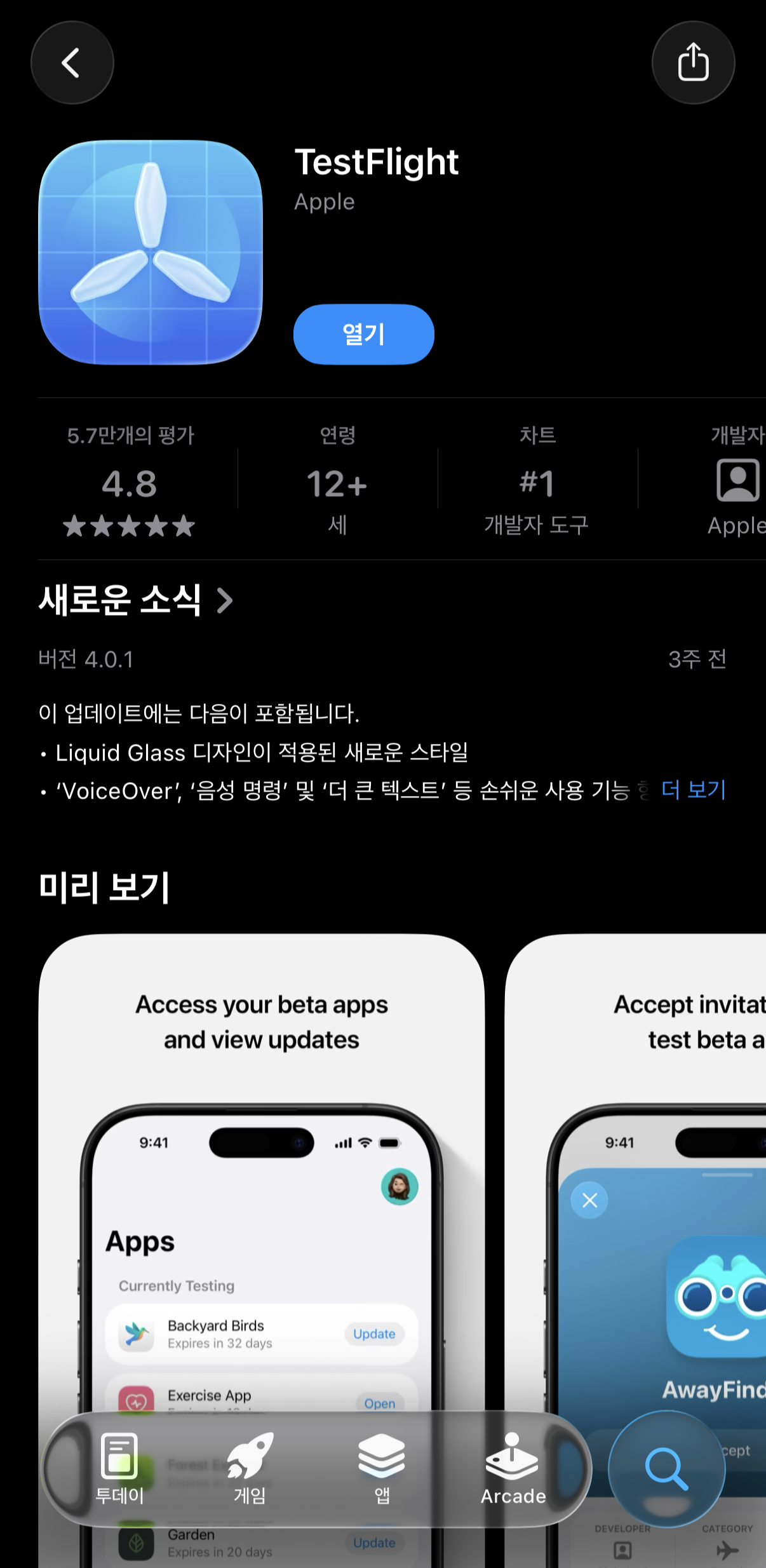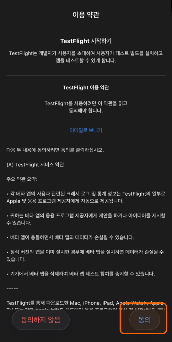 5. TestFlight 이용 약관 동의 후, 수락 버튼이 노출되며, 클릭 시 초대 수락이 완료됩니다.