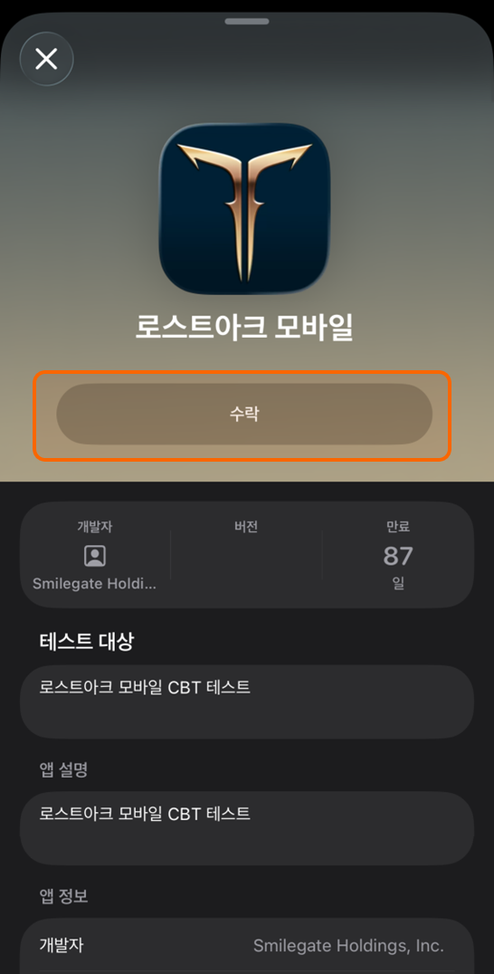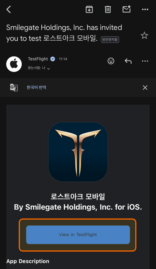 3. 초대 메일 내 View in TestFlight 버튼을 클릭하여 안내에 따라 순차적으로 로스트아크 모바일 CBT 앱을 다운로드합니다.