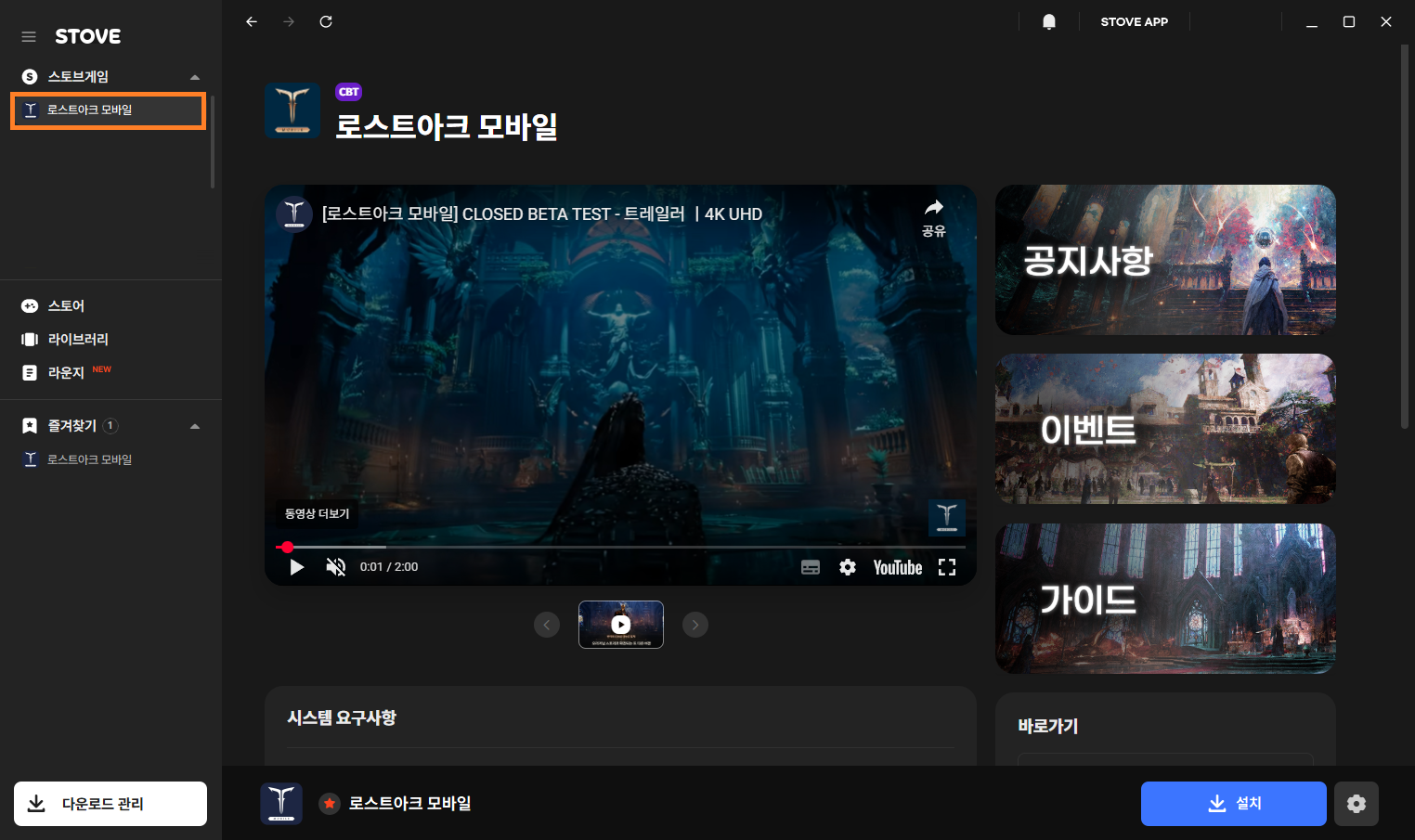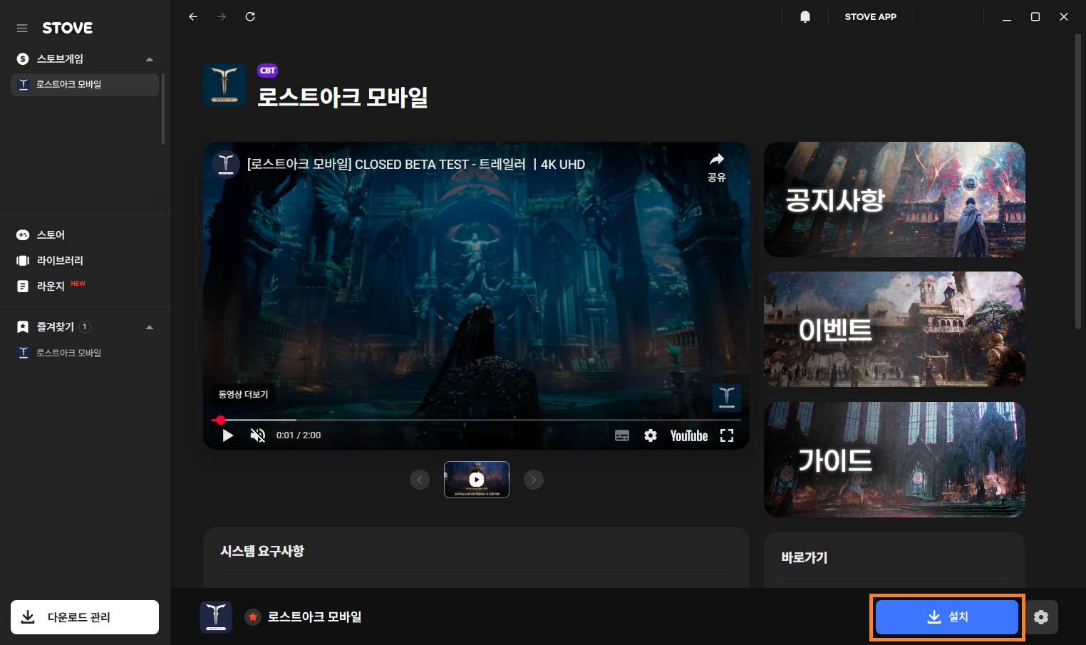 - 테스트 종료 후 기기에서 앱을 삭제해 주세요. ■ PC 클라이언트 설치 안내1. STOVE 클라이언트를 다운로드 후, 테스트 신청에 사용한 STOVE 계정으로 로그인해 주세요. 2. 실행된 STOVE 런처 화면에서 좌측 상단에 위치한 '로스트아크 모바일' 게임 아이콘을 선택해 주세요. ※ 게임 아이콘이 보이지 않을 경우, STOVE 런처를 완전히 종료 후 다시 실행해 주시기 바랍니다.