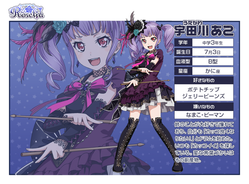 (캐릭터가 생일) 제목 : 뱅드림 이름 : 우다가와 아코 성우 : 사쿠라가와 메구 이미지 컬러 = 분홍색