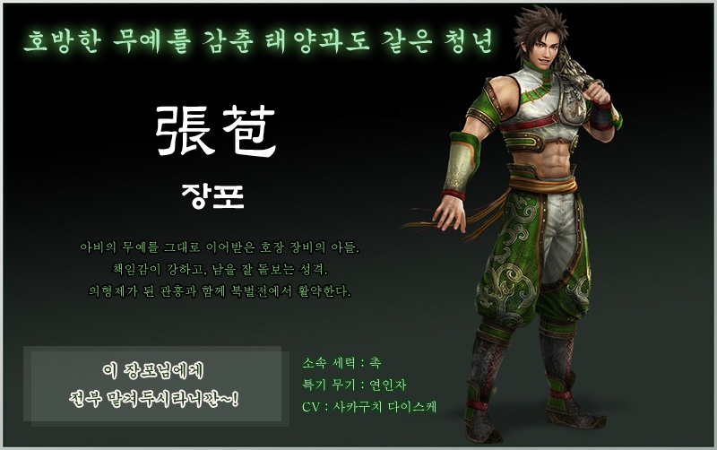 (성우가 생일) 제목 : 진삼국무쌍 이름 : 장포 성우 : 사카구치 다이스케 (일) / 조니 용 보쉬 (미)