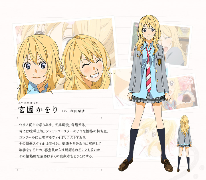 (성우가 생일) 제목 : 4월은 너의 거짓말 이름 : 미야조노 카오리 성우 : 타네다 리사 (일) / 이용신 (한) / 에리카 린드벡 (미) (성우가 생일) 제목 : 수호 캐릭터 (일) / 캐릭캐릭 체인지 (한) 이름 : 히나모리 아무 (일) / 채아무 (한) 성우 : 이토 카나에 (일) / 이용신 (한) ※. 선생이 이름 잘못 부른 케이스 = 히마모리 (일) / 아무개, 지우개 (ㅋㅋㅋㅋㅋㅋ)(한)