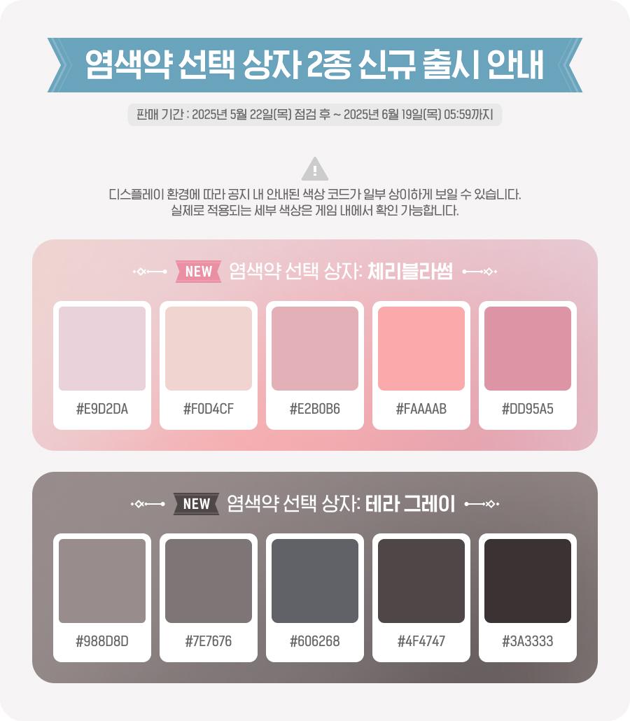 ◼ 판매 기간 : 2025년 5월 22일(목) 점검 후 ~ 2025년 6월 19일(목) 오전 5시 59분까지 ◼ 판매 위치 : [게임 내 메뉴] → [캐시샵] → [아이템샵] → [캐시샵 포인트] ◼ 판매 가격 : 500 캐시샵 포인트 ◼ 염색약 선택 상자 종류 및 상세 내용