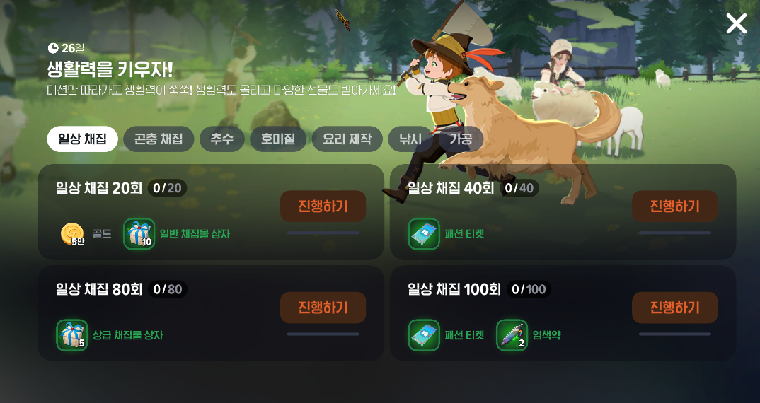 📢 해당 이벤트의 미션별 진행 횟수는 누적 적용됩니다. (예시: 20회 일상 채집 완료 시, 일상 채집 관련 미션의 진행 횟수가 전체 20회 카운트됩니다.)