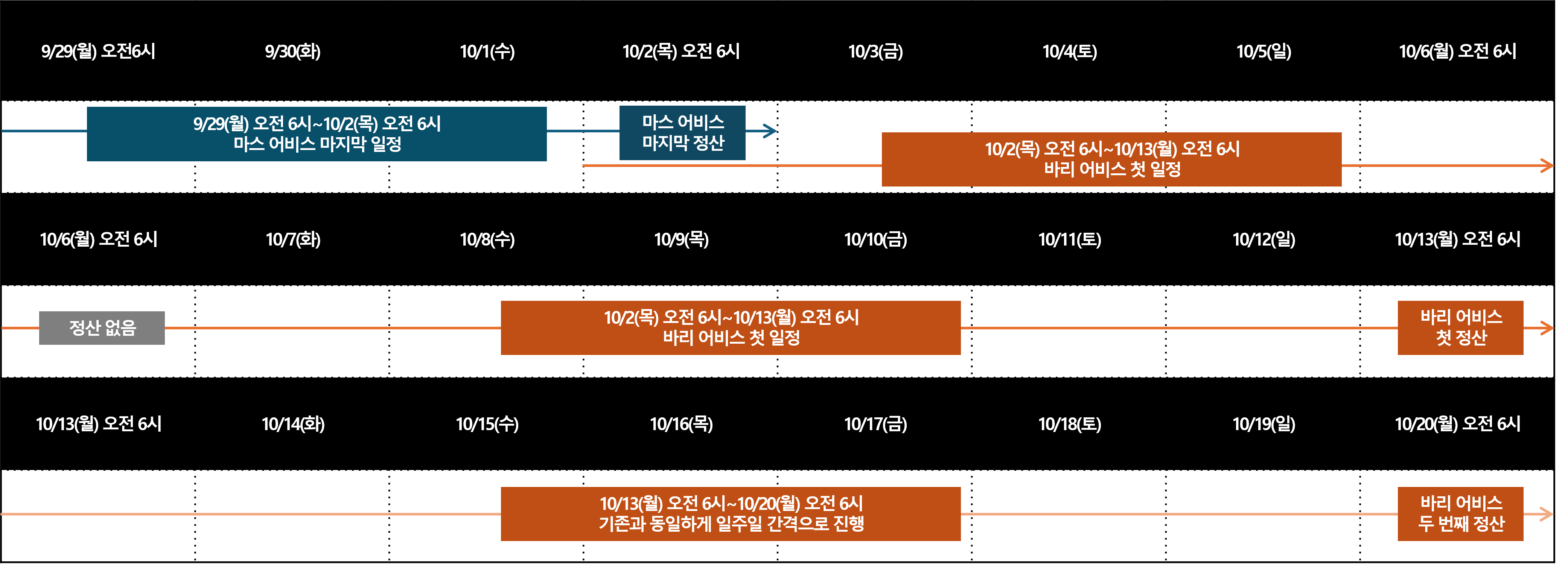 ◼ 마스 어비스 마지막 일정 및 바리 어비스 첫 일정 - 9월 29일(월) 오전 6시 ~ 10월 2일(목) 오전 6시 전까지: 마스 어비스 마지막 일정 및 전리품 정산 - 10월 2일(목) 오전 6시 ~ 10월 13일(월) 오전 6시: 바리 어비스 첫 일정 및 전리품 정산 * 10월 13일(월) 오전 6시부터 기존 어비스 진행 기간과 동일하게 매주 월요일 오전 6시에 정산됩니다.