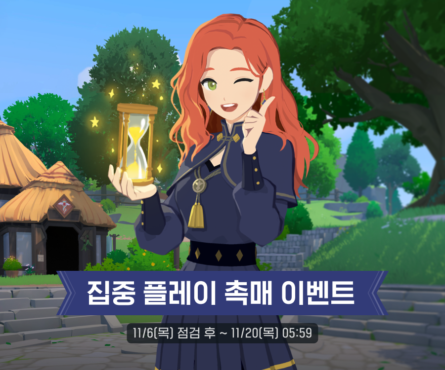 ◼ 이벤트 기간: 2025년 11월 6일(목) 점검 후 ~ 2025년 11월 20일(목) 오전 5시 59분까지 ◼ 이벤트 내용 - 이벤트 기간 동안 우측 상단 [메뉴(≡)] → [이벤트] → [집중 플레이 촉매 이벤트] 탭에서 누적 출석 수에 따라 선물을 받으실 수 있습니다. - 이벤트 기간 동안 누적 접속 조건을 충족하시면 선물을 매일 획득할 수 있습니다. - 매일 최대 2시간 누적 접속하시면 이벤트 선물을 모두 수령하실 수 있습니다. * 누적 접속 시간은 오전 6시에 초기화됩니다.