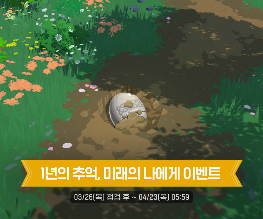 ◼ 이벤트 기간: 2026년 3월 26일(목) 점검 후 ~ 2026년 4월 23일(목) 오전 5시 59분까지 ◼ 이벤트 내용 - 이벤트 기간 동안 우측 상단 [메뉴(≡)] → [이벤트] → [1년의 추억, 미래의 나에게] 탭에서 이벤트 내용을 확인하실 수 있습니다. - 이벤트 기간 내 게임에 접속하면 서버당 1회 온타임 선물을 획득하실 수 있습니다. ※ 온타임 선물은 2026년 3월 26일(목) 점검 후 ~ 2026년 4월 23일(목) 오전 5시 30분까지 지급됩니다. * 온타임 이벤트 선물은 [서버 우편함]으로 지급됩니다. * 우편함이 가득 찬 경우, 온타임 우편이 지급되지 않을 수 있으니 우편함 내 여유 공간을 확보해 주세요.