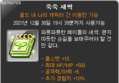 길라잡이 보상 쑥쑥 새싹 세트2차 전직 달성 <쑥쑥 새싹>칭호, <쑥쑥 화분 명찰 반지>, <쑥쑥 화분 말풍선 반지> 3차 전직 달성 <쑥쑥 새싹 모자> 140 레벨 달성 <쑥쑥 새싹 데미지 스킨> 180 레벨 달성 <쑥쑥 새싹 무기> 5차 전직 달성 <꿈나무> 훈장 ![]() ![]() ![]() ![]() ![]() ![]() ![]() 명찰 및 말풍선은 영구 아이템인지 확인 필요.