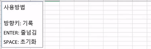 사용 방법은 아래 그림을 보시면 쉽게 이해할 수 있습니다. ![]() 방향 키를 입력하면 입력한 순서대로 기록이 남으며 엔터키를 입력하면 다음 줄로 넘어가고, 스페이스바를 입력하면 기록된 내용이 모두 지워집니다. ------------------------------------------------------------- 혹시 엑셀에 기록될 때 [한글]이 아니라 [특수 문자]로 기록되는 것을 원하시면, 아래와 같이 수정하시면 됩니다. [개발 도구] - [Visual Basic]에 들어가셔서, Worksheets("Sheet1").Cells(i + 3, j + 3) = "오른쪽" 과 같이 적힌 코드를 Worksheets("Sheet1").Cells(i + 3, j + 3) = "→" 과 같이 수정하시면 됩니다. 다른 방향키 모두 동일한 방식으로 수정하시고 저장(Ctrl+S)하시면 됩니다.