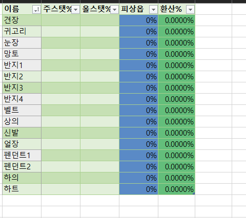 본 엑셀의 기능은 크게 2가지 있습니다. 1. 부위별 아이템 및 스타포스 수치별 옵션 비교 예시: ![]() [*환산값 = ( 스탯 ) + ( 공/마 * (공/마~주스탯변환값) ) + ( 추옵보정값 ) ] 2. 자신의 아이템의 추가옵션&잠재능력 정리 예시-잠재능력: ![]() [*환산% = 주스탯% + (올스탯% * 올스탯%~주스탯%변환값) 예시-추가옵션: ![]() [*환산값 = 주스탯 + (부스탯*부스탯~주스탯변환값) + (공*공~주스탯변환값) + (올%*올%~주스탯변환값) 필요설정: ![]() 1.아이템 시트 2. 공/마 1당 환산될 주스탯 값 입력 예시-2: ![]() 3. 레벨제한 별 보정 될 추가옵션 입력 예시-3: ![]() 4. 추옵&잠재시트 5. 각 옵션별 환산값 입력 예시-5: ![]() 6. 아이템 별 추가옵션 입력( 환산값은 자동으로 계산됨 ) 예시-6: ![]() 7. 아이템 별 잠재능력 입력( 환산값은 자동으로 계산됨 ) 예시-7: ![]() *아이템을 추가하고 싶을 경우 ![]() ![]() 누르고 우측 하단 네모를 내리면 됨 |