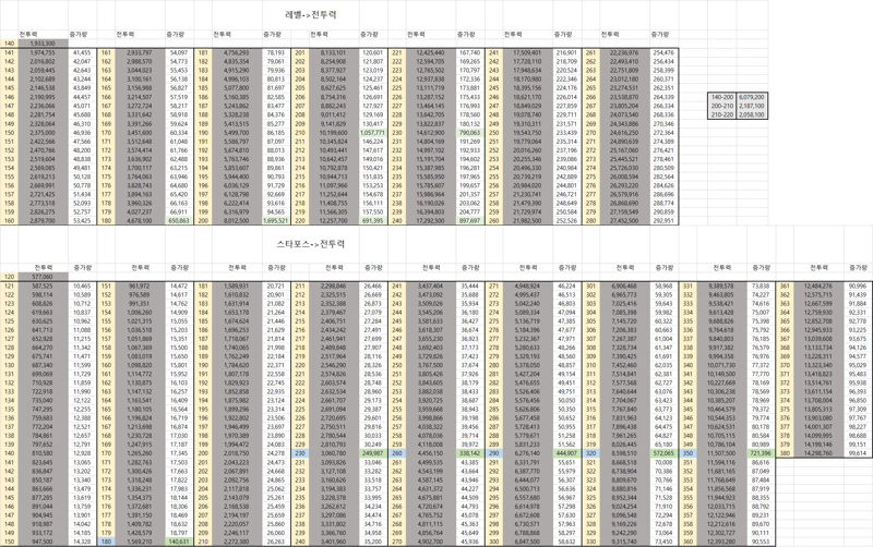 유니온 전투력 표![]() 레벨별 스타포스별로 정리함 색칠한 부분은 분기점 넘어서 점프 뛰어서 크게 증가한 구간임 레벨별 전투력에서 유니온나왔을때가 250만렙이라 250부터는 점프뛰는 구간이 없음 오른쪽에 적어놓은건 유니온작할때 얼마나 전투력이 오르는지 적어놓은건데 200-210구간이 210-220보다 전투력 많이 오르니깐 참고하시고 스타포스별 전투력에서는 길드스킬, 칭호, 훈장 등 다 빼고 대입해야함. 대충 만든거라 1의자리에선 오차 발생가능하니깐 대충보셈