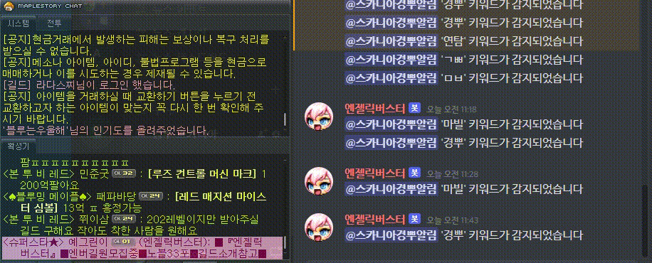 경뿌 고확 알림 봇![]() 반응이 괜찮아서 엘리시움도 추가하였습니다. 다른 디코 서버에도 알리미를 추가하실 수 있도록 웹훅 URL 등록 기능을 지원합니다. 현재 지원 서버 : 스카니아, 루나, 엘리시움 메이플 히스토리 • 홈페이지 - maplehistory.kr • 디스코드 - discord.gg/GUKzG6Evad 엔버봇 • 홈페이지 - angelic.kr • 디스코드 - discord.gg/3BXdhqBvtp • 카카오톡 - open.kakao.com/o/gzSNxg0f