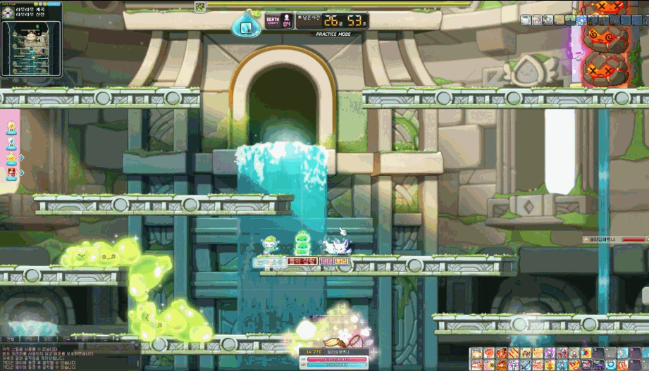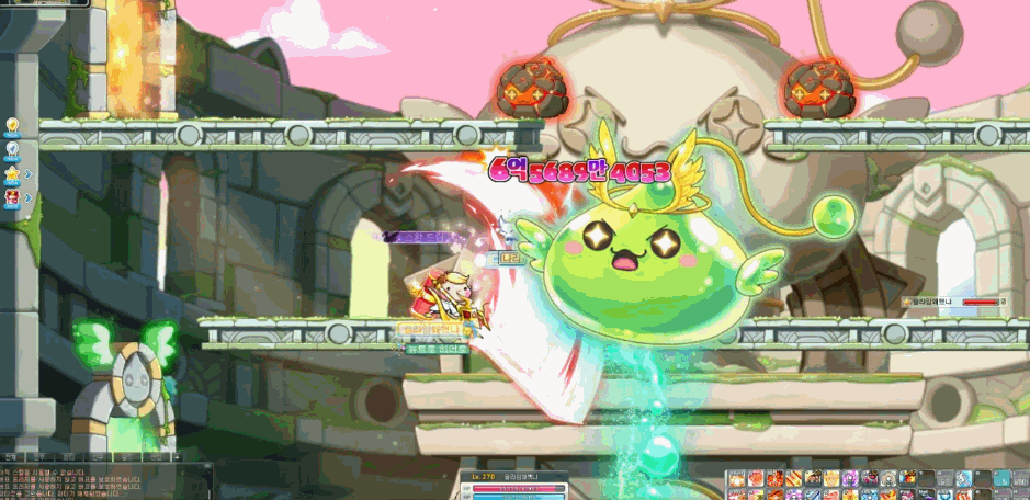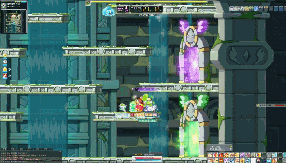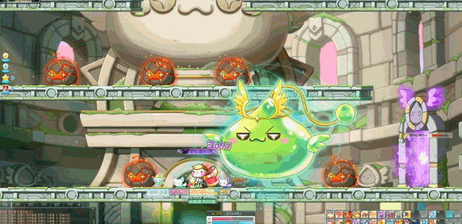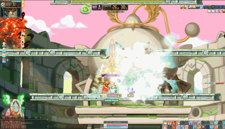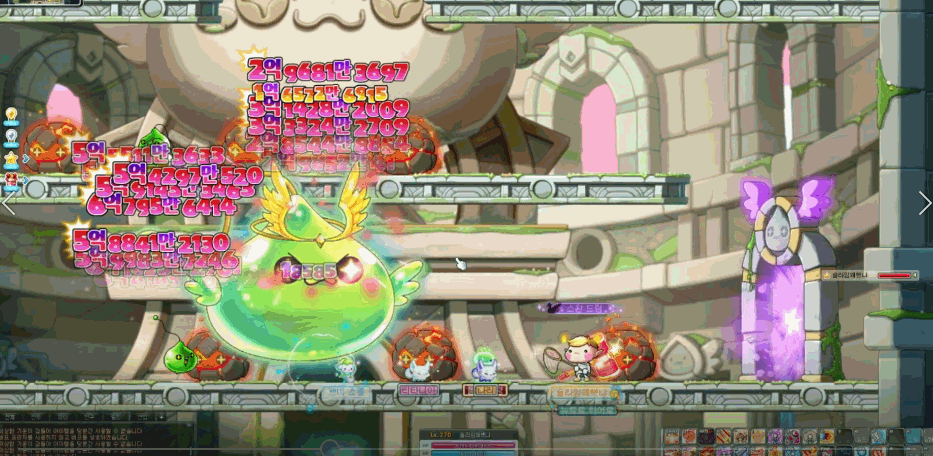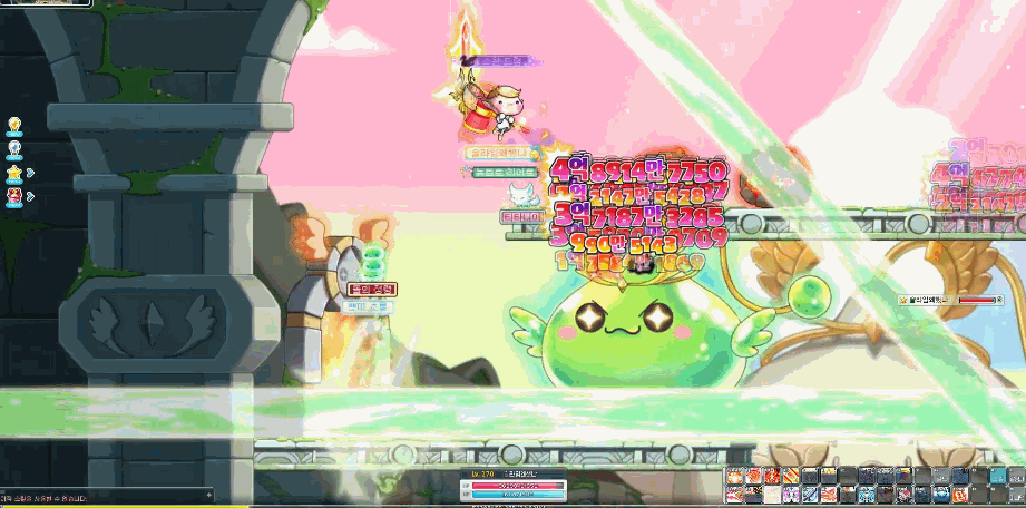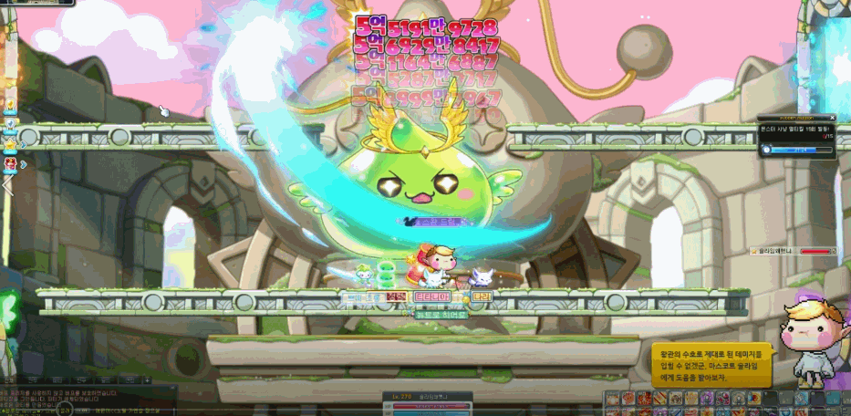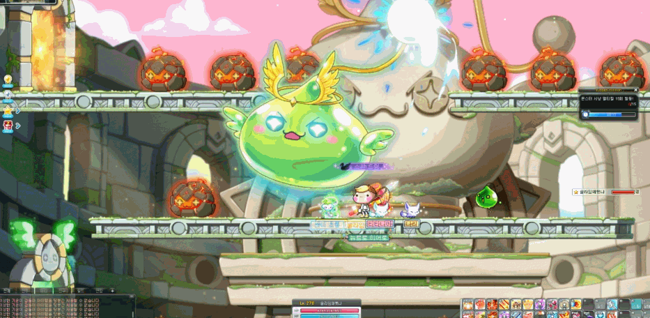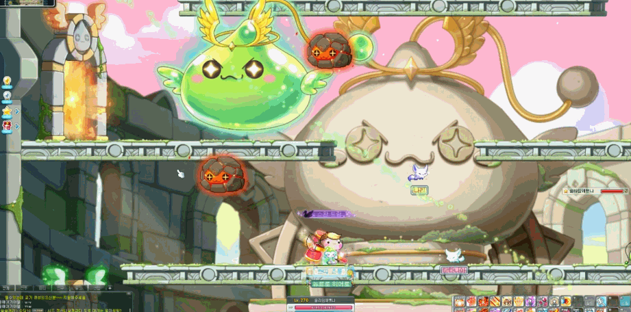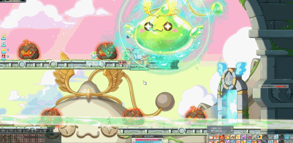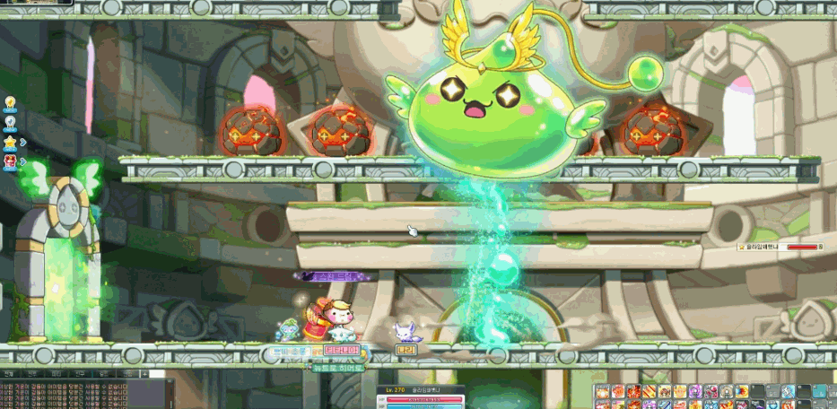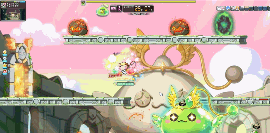가디언 엔젤 슬라임 패턴설명주의사항: 패턴 이름은 제 맘대로 지음, 체비뎀은 노말 기준, 별 많을수록 위험한 패턴 1. 쫄슬라임 전체 맵 1~4층에서 1~2층에서만 소환됨 1-1. 일반 슬라임 (★) ![]() 몹박 시 체비뎀 5% 걍 무시해도 되는수준 1-2. 마그마 슬라임 (★) ![]() 몸박 시 체비뎀 5% 무시해도 되지만 그렇다고 계속 붙어있으면 아픔 1-3. 매혹 슬라임 (★★★★) ![]() 주변에 갈 경우 매혹 + 체비뎀 15% 다른 패턴이랑 연계되면 데카 순삭 ![]() 파훼법 : 의지쓰기 1-4. 자폭 슬라임 (★★) ![]() 다가가면 자폭하며 체비뎀 15% 그냥 따가움 1-5. 토끼 슬라임 (★★) ![]() 다가가면 공격하며 체비뎀 15% 얘도 그냥 따가움 ----------------------------------------------------------------------------------------------------------------------------------- 2. 본체 패턴 2-1. 텔레포트 (★) ![]() 낮게 점프 + 파란색 보호막이 생기며 텔포 그냥 평범한 텔레포트 2-2. 점프 (★★★★★) ![]() 높게 점프 + 착지할 떄 바닥에 있다면 체비뎀 100% 데카 까이면 절반은 이 패턴때문에 까임 점프 패턴 시 같은 층 바닥에 있다면 무조건 맞음 반대로 다른 층에 있다면 그냥 가만히 있어도 피해짐 ![]() ![]() ![]() 파훼법 : 착지 하는 타이밍에 점프 or 다른 층으로 대피 2-3. 밀쳐내기 (★★★★) ![]() 넉백 + 20%체비뎀 + 3초기절 특이사항 : 슈스탠으로 넉백 막기 가능, 기절에 의지 안먹힘 다른 패턴이랑 연계되기 쉬움 ![]() 파훼법 : 엎드리기, 점프와 마찬가지로 다른층에 있으면 안맞음 2-4. 붉은 레이저 (★★★) ![]() 공격 딜레이 짧음 + 체비뎀 25% + 범위넓음 반응속도 빨라도 피하기 힘듦 밀쳐내기 패턴이랑 연계 많이함 피가 많으면 맞고 없으면 무적기 써야함 짤에 보이는 히든포탈이 3층 왼쪽으로 연결되는데 그거로 피해도 될듯(안해봄) 슬라임이 한층 아래에 있어도 맞음 2-5. 장판깔기 (★) ![]() 노란색 효과 + 많이 낮은 점프 + 자신 주변에 슬로우 장판 생성 장판에 가면 슬로우 + 1%체비뎀 여러번 걍 무시해도 됨 2-6. 슬라임 소환(★) 짤 없음 그냥 말그대로 슬라임 소환하고 끝 2-7 마그마 슬라임 소환(★) 마찬가지 ----------------------------------------------------------------------------------------------------------------------------------- 3. 맵 패턴 3-1. 초록 레이저(★★★★) ![]() 닿으면 10% 체비뎀 여러번 + 3초경직 10% 체비뎀은 최대 6번 = 60% 체비뎀 꽤 아픔 3초 경직때문에 다른 패턴이랑 연계되면 데카 -1 웬만하면 피해야 하는 패턴 피가 깎일수록 3개까지 늘어남, 층 전체에 레이저 쏘는 경우도 있음(점프 패턴 설명 짤 참고) 블링크(체공) 활용이 중요함 3-2. 슬로우(★) 짤 없음 무시해도 됨 ----------------------------------------------------------------------------------------------------------------------------------- 4. 가디언 웨이브(★★★★★) ![]() 보스맵 평상시 : 2층만 열려있음 가디언 웨이브 시작 : 1층까지 넓어짐 가디언 웨이브 성공 방법 : 위층에서 막은 색깔과 같은 색을 가진 1층 포탈로 슬라임을 넣어야함 만약 2층 보라색 포탈을 막았다면 1층 보라색 포탈로 슬라임을 유인해서 넣어야함 1층 포탈 색은 가디언 웨이브마다 랜덤 ![]() 포탈 막는 법 : 평상시 npc/채집 키를 눌러 슬라임 대포를 쓸 수 있음 npc/채집키를 눌러 대포사용 -> 위, 아래 방향키로 방향 조절 대포로 마그마 슬라임을 맞춰서 포탈을 막을 수 있음 마그마 슬라임 3마리를 채워야 완전히 막아짐 ![]() 슬라임 유인 방법 : 1층에서 npc/채집키를 눌러 크리스탈을 만들 수 있음 (발판 1개에 크리스탈 1개만 만들 수 있음, 제일 밑 바닥도 1개만) 짤에서는 초록포탈 뺴고 다 막은 상태라 초록만 막음 ![]() 보라색 포탈을 막은 상태이므로 보라색에 슬라임을 넣으면 성공 ![]() 성공하면 중앙에서 10초 극딜타임 바인드 한다고 딜타임이 늘어나진 않음 하지만 바인드 쓸 곳이 없으므로 극딜타임 끝나고 써서 극딜버프가 남아있을 때 뎀감상태라도 딜 넣는게 이득 다음 글에선 실전 운영 방법에 대해서 쓸 예정(1~2시간 뒤)