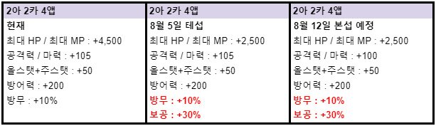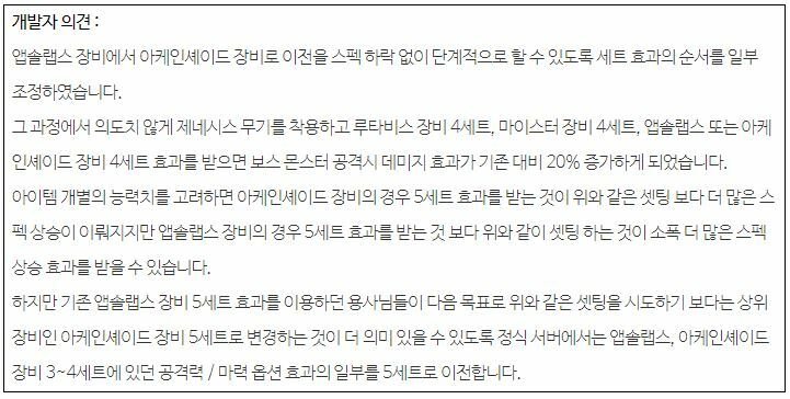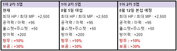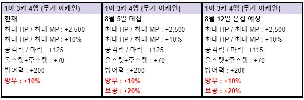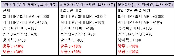 세트효과 변경 전, 후 비교 (444 해방제외)앱솔 -> 아케인 완화 1아 2카 5앱 상태에서 앱솔랩스 장비를 아케인으로 하나씩 교체해도 보공 30%를 유지할 수 있고 교체할때마다 공격력 / 마력 or 올스탯이 조금씩 증가합니다. 기존과 동일 3카 5앱 (방무 10%, 보공30%) 1아 2카 5앱 (방무 10%, 보공30%) 5아 3카 (방무 10%, 보공30%) 신규 세트 하향 (8월 5일 수치 -> 8월 12일 수치) 2아 3카 3앱 (보공30%) ㄴ 2아 3카 3앱의 경우 1아 2카 5앱이랑 비교하면 방무 10%를 줄이는 대신 (공/마 +30 -> +25)이 증가됩니다. 1아 3카 4앱 (방무 10%, 보공20%) ㄴ 1아 3카 4앱의 경우 1아 2카 5앱이랑 비교하면 보공 10%를 줄이는 대신 (공/마 +30 -> +20)이 증가됩니다. 개발자 의견 요약 8월 5일 테섭과 비교를 했을때 앱솔랩스, 아케인셰이드 3~4세트를 하향하고 하향한 만큼 5세트로 이전 ![]() ![]() ![]() ![]() ![]() 2아 3카 3앱 (1아 2카 5앱이랑 비교를 하면 방무 10%를 줄이는 대신 공/마 +25) ![]() 1아 3카 4앱 (1아 2카 5앱이랑 비교를 하면 보공 10%를 줄이는 대신 공/마 +20) ![]() ![]() 1. 링크스킬 유니온 정리 + 부캐릭 육성 직업 순서 추천 |