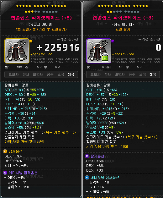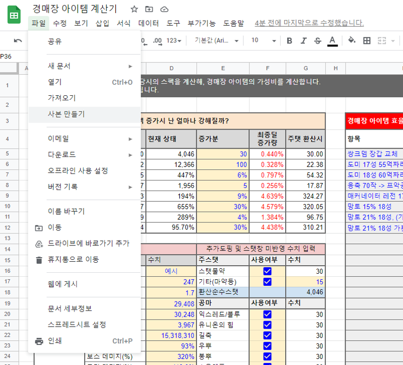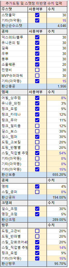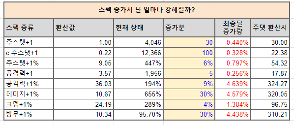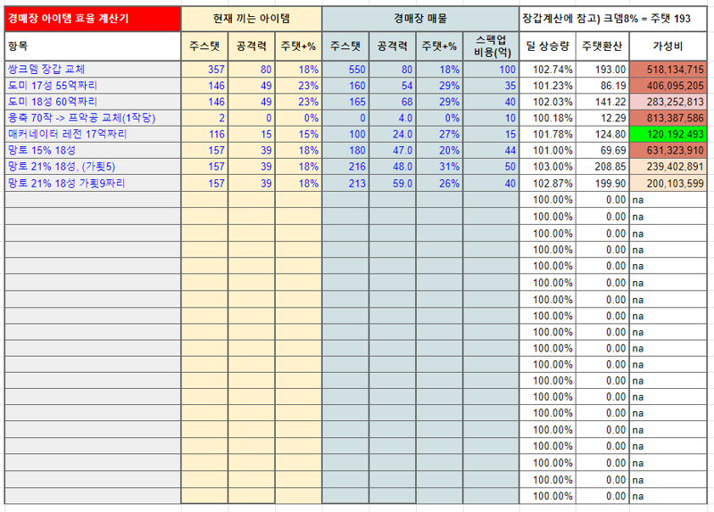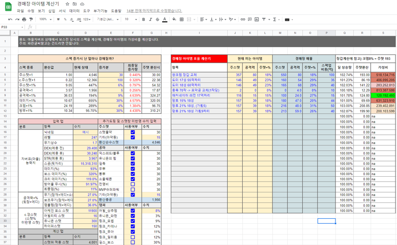 아이템 가성비 계산기![]() 경매장에서 대략적인 스공 상승치는 알 수 있지만, 이 값은 실제 효율과는 약간 다르다. 경매장 스공비교는 도핑을 고려하지 않기 때문인데, 예시로 스탯도핑보다 공마도핑이 더 많기 때문에, 공격력이 고평가되는 문제가 있음 그래서 보스전을 상정했을 때, 아이템의 가성비를 확인해 경매장에서 어떤걸 사야 효율충이 될 지 계산해왔다. ![]() 사용법 1단계. 마을스공 입력하기 ![]() 입력 탭에는 자버프 상태에서 능력치를 작성한다. 공퍼는 스탯창에서 안보이니까 무보엠 잠재와 에디에 붙은걸 직접 계산해주자. 무기상수는 나무위키가면 나옴 2단계. 보스전에 먹고갈 도핑 체크하기 ![]() 이거 쓸정도로 메창이면 약어는 설명 안해도 될거고... 뎀퍼랑 방무에 직업별 추뎀/직업별 추방이라고 적힌게 있는데 자기 주력기에 전투시에만 확인할 수 있는 추가 데미지 or 추가 방무가 있을 경우 적당히 계산해서 입력한다. 엔버는 추뎀 54%, 추방14%니까 참고하셈. 엔 버 조 아 3단계. 1차 스탯효율 계산기 활용 ![]() 1단계, 2단계를 멀쩡하게 입력하면 이렇게 나온다. c.주스탯: 스탯퍼가 적용 안되는 주스탯이고, 거의대부분 아케인포스라고 보면됨 읽는법 "환산값"은 각 스펙을 주스탯으로 환산하면 얼마정도 가치를 보이는지를 적어둔 것이다. 본인은 메린이는 아니라서 공1당 주탯 3.57, 주탯1%당 주탯9.05가 나온다. 만약에 보보공과 보공공을 비교하고 싶다? 그러면 노란섹 셀에 값을 입력해서 보공30%와 공9%중 뭐가 더 딜상승량이 높은지 보면됨 나는 미세하게 보공공이 더 좋은 상황임. 4단계. 템 가성비 계산기 ![]() 최종 결과물이다. 무보엠+(장갑)을 제외하면 아이템 교체시 바뀌는건 주탯, 공마, 주탯퍼니까 그거만 적어주면 된다. 알아서 다 계산해서 최종 전투력으로 환산한 다음, 매물 가격으로 나눠서 가성비를 뽑아준다. 여기서 가성비란? 주탯 10올리는데 드는 메소를 말함 그림 예시를 보면 망토 3종류를 지금 경매장에서 보고 적어본거다. 50억짜리보다 40억짜리를 사야 호구가 아니겠지? 잘 쓰기 바람. 아마따 ![]() 보기 전용이라 수정 못하니까 링크 들어가서 "사본 만들기" 로 복사해서 사용해야됨 https://docs.google.com/spreadsheets/d/1vE-himfGEruezgvJP7xt9V7gaqTN0xS5M4oxzCANVUE/edit?usp=sharing 수구바위 번외: QNA 네. 부탯 2개인 직업이 있어서 복잡해서 안했습니다. 올탯10% = 주탯9%정도 생각하면 편함 Q2. 기본옵, 추옵, 잠재, 에디잠재 이런거 다 더해서 입력하는거임? 네. 잘 더해서 입력하세요. Q3. 크뎀장갑은 우찌함? 크뎀 8%가 주탯얼마인지 적어놨으니 그거를 직접 더해주세요. 계산기 우상단에 있음 Q4. 무보엠도 계산해주세요. 만들었는데 나만쓸거임 ㅋ 무보엠은 국룰 따라가면 됩니다. 17성 아케인 15완작 2추보뎀 보보공 공공 사세요.