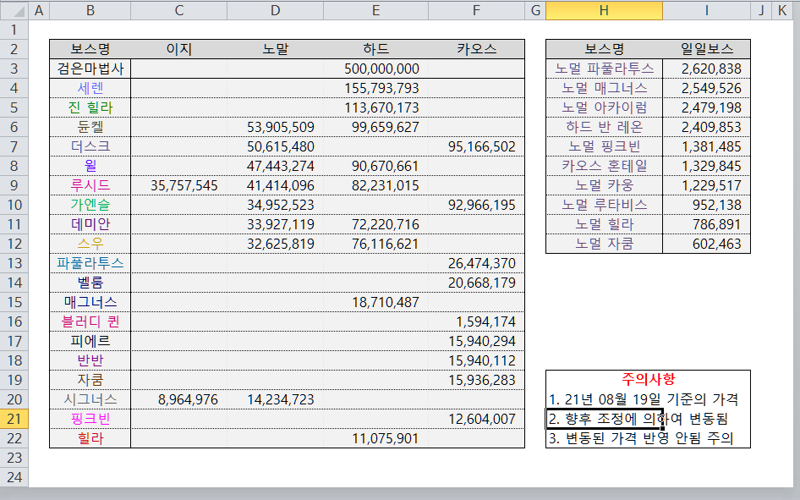 결정석 가격계산기원본 출처 : https://m.inven.co.kr/board/maple/2304/14237 참고본 : https://www.inven.co.kr/board/maple/2304/28680 허락은 참고본의 제작자의 동의를 받았으며, 원제작자의 요청시 언제든 삭제될 수 있습니다. ![]() 1.이름과 참여여부를 결정 해 주세요. ![]() 2월간·주간 보스는 참여여부를 일일보스는 주간 판매량을 입력하시면 됩니다. ![]() 3. 단순한 데이터테이블이며 작성일인 21년8월15일 기준의 가격입니다. p.s 시간 여부에 따라 변동된 가격이 업데이트 안 될 수도 있습니다. 210819_변동사항 - 8월 19일 결정석의 변동사항을 반영하였습니다. - 노말 힐라와 노말자쿰을 추가하였습니다.