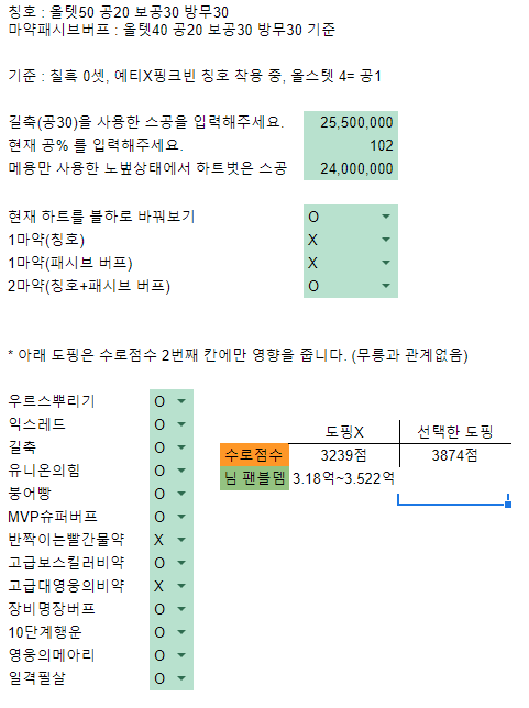 무릉계산기 (듑,팬,섀,나로,불) + 듑 추가엑셀https://docs.google.com/spreadsheets/d/1KIlVsueE-wt4q-fEfOO1RzMet0wQ2TIVuCPOJ1IoGgc/edit?usp=sharing