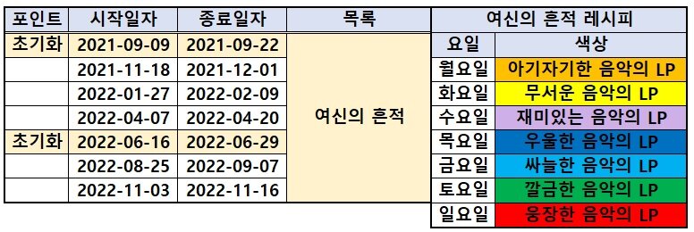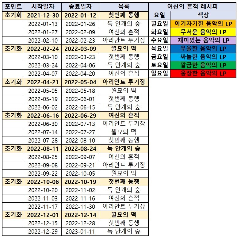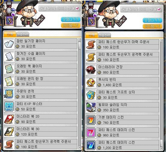 월드 파티 퀘스트 일정표![]() 월드파티퀘스트일정 1)빠른순서(작성자 기준) 월묘의 떡 - 아리안트 투기장 - 첫번째 동행 - 여신의 흔적 - 독 안개의 숲 2)포인트 초기화 8주마다(목요일 초기화) 3)캐릭별 하루 5회 입장 4)포인트:슈피겔라 퀘스트(5회 입장 완료) 총 60점 5)투사반지 기준(포인트 최대 큰거1,480점) 약 25일(약 4주) 6)레벨제한:70이상 4명필요 7)파티원끼리 레벨제한없이 빠르게 클리어 8)1회 클리어시 레벨에 맞는 상당한 경험치 획득(주요 유니온 레벨 올리기용 혹은 경험치 획득,데미지 스킨 획득) 포인트로 한손무기혹은 두손 공격무기 주문서로 심장 공격력 작하기(주문서 바르기전 마일리지로 세이프티 주문서 사용) 혹은 한손무기 마력주문서로 심장 마력작 하기(주문서 60%확률 성공시 공격력 혹은 마력 5 상승) 여신의 흔적 사용법 아리안트 하는법 1)아리안트 몬스터 사냥시 일정확률로 검은 돌 드랍 총 100개 먹기 2)중간 거대 스콜피온 등장하여 맵 중간마다 폭탄 설치(폭탄 맞을경우 획득한 돌 뱉음) 3)빠르게 거대 스콜피온 제거후 드랍된 아이템을 먹으시는걸 추천드립니다.(일정시간마다 거대스콜피온 등장) 월묘 하는법 1)처음 시작시 하단부분에 돼지을 제거하여 일정확률로 드랍된 씨앗 6개 획득 2)중간 위치에 씨앗심는곳을 클릭(올라가지 않아도 마우스 클릭시 씨앗심기 가능) 3)씨앗 6개 심을경우 중간에 월묘가 떡방아을 시작 총 80개 혹은 100개떡을 획득하기 4)월묘가 떡방아을 하는동안 양쪽에서 몬스터 출현하면 빠르게 제거 5)몬스터에게 최대한 맞지않고 떡을 빠르게 먹어 클리어하기 첫번째 동행 하는법 1페이즈)방장을 제외한 3명은 npc에게 말하여 획득해야하는 티켓수량 확인 몬스터을 제거하여 요청한 티켓수량만큼 획득후 NPC에게 말하기(이때 화면에 티켓 몇장 획득했다고 나오는 확인) 총 3개(방장 제외 3인당 1장씩) 출입증을 모우고 방장은 NPC에게 말하여 통과하기