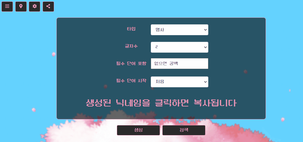 메이플 브금을 많이 사랑해주셔서 보답하고자 신기능을 추가로 개발했습니다 랜덤 닉네임 생성기입니다 간단히 테라버닝캐 닉네임 정하려고 만들었는데 기능 추가해서 배포합니다 타입 설정으로 무지성 닉네임 생성 가능합니다 ![]() 설정에서 검색 옵션을 지정하고 생성된 닉네임으로 월드 랭킹 / 국어사전 검색 가능합니다 ![]() * 지난 업데이트 내역 - 메이플 브금 실시간 HOT 추천 기능 추가 ![]() - 코디 시뮬레이터 스라벨 101기 업데이트 ![]() 감사합니다!
