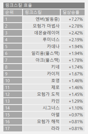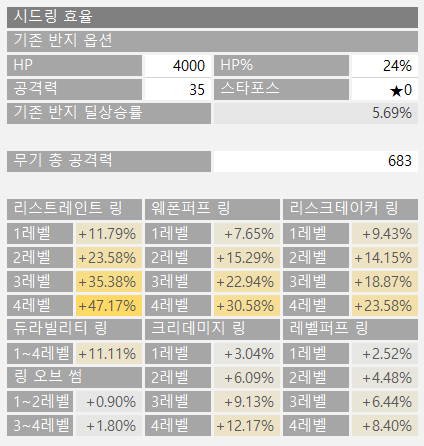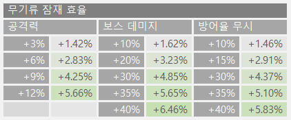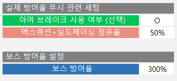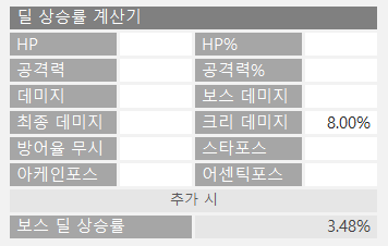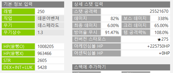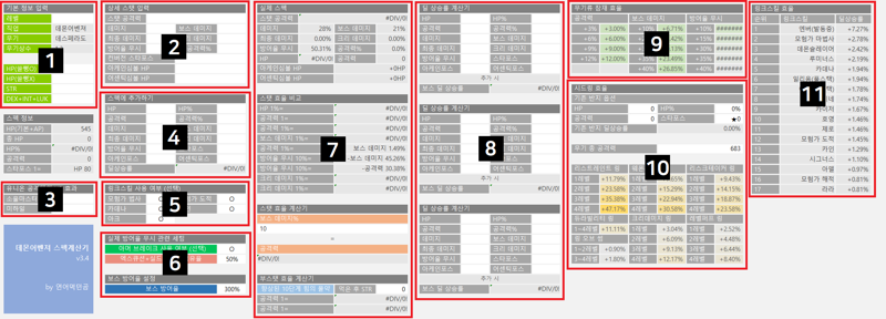 데몬어벤져 스펙계산기 3.4 사용법안녕하세요 데몬어벤져 스펙계산기 v3.4 사용법을 하나씩 상세히 설명해 드리려고 합니다. 기본세팅 스펙계산기를 입력하기 전, 먼저 (1) 링크와 유니온을 평소 사용하는 세팅으로 설정해주세요. 그다음 (2) 펫버프, 오라웨폰, 쓸만한 스킬을 모두 사용해주시면 준비 완료입니다! ![]() * 입력 도중 위 버프가 꺼지면 다시 리필한 뒤 입력해주시면 됩니다. (꺼진 상태로 입력하시면 안돼요!) ![]() 번호를 보고 잘 모르겠는 부분만 찾아서 보셔도 좋을 것 같습니다. 1,2번 ![]() HP (쓸뻥O) 는 스탯창 HP에 마우스를 올려서 보고 입력하시면 됩니다. **HP (쓸뻥X) 는 1,2번 박스 입력이 모두 끝난 뒤, 쓸만한 하이퍼바디를 버프창에서 우클릭으로 해제하고 마지막으로 입력해주시면 됩니다. 템 공격력% 의 경우 무기/보조/엠블렘 잠재능력과 무기의 소울옵션을(공 3%일 경우만) 합산하여 입력해주시면 됩니다. 아케인심볼 HP 는 장비창을 열어서 확인해주시면 됩니다. 컨버전 스타포스 는 0차스킬 "컨버전 스타포스"에 마우스를 올려 확인할 수 있습니다. 3번 ![]() 소울마스터와 미하일 유니온 레벨 60/100/140/200/250에 따라 각각 HP 250/500/1000/2000/2500 을 입력해주시면 됩니다. 4번 ![]() 보스, 무릉을 갈때 사용하는 도핑과 버프를 합산하여 입력하시면 됩니다. ![]() 저같은 경우 고보킬(보공 20%), 전체비(HP 7000), 익스레드(HP 2000, 공격력 30), 길축(공격력 30), MVP(공격력 30), 유니온의 힘(공격력 30), 우뿌(공격력 30), 붕뿌(공격력 30), 영메(공격력 4%), 노블 30포(데미지 30%, 크뎀 30%)를 사용하기에 이를 합산해서 HP 9000, 공격력 180, 공격력 4%, 데미지 30%, 보공 20%, 크뎀 30%를 입력했습니다. 5번 ![]() 스탯창에 표시되지 않는 링크스킬을 사용하는지 여부를 체크하기 위한 부분입니다. 사용하시면 O를, 사용하지 않으시면 X를 선택해주시면 됩니다. (클릭하면 오른쪽에 드롭다운 화살표가 나옵니다) 저같은 경우 모두 사용하기에 모두 O를 선택했습니다. 6번 ![]() 스탯창에 표시되지 않는 실방무를 반영하기 위한 부분입니다. 평소 아머브레이크를 사용하신다면 O를 선택해주세요 엑스큐션+실드체이싱 점유율이 높을수록 실방무가 높아집니다. 원하시는 대로 0%, 40%~70% 중에 선택해 주세요. 0%을 선택한다면 프렌지 기준이 됩니다. (잘 모르겠으면 50%로 하시면 됩니다.) 보스 방어율 설정 은 매우매우 중요합니다 별표 5개 ***** 여기서 설정하는 방어율에 따라 스펙계산기의 모든 방무 효율이 계산되게 됩니다. 대부분의 보스가 방어율 300%이고, 무릉도장의 경우 60층 미만까지는 방어율 50%입니다. 즉 보스 기준으로는 방어율 300%를, 무릉 기준으로는 방어율 50%를 설정해 주시면 되겠습니다. 7번 ![]() 스펙계산기를 사용하는 주된 이유라고 볼 수 있는 부분입니다. 실제 스펙 부분은 모든 도핑과 스탯창에 표시되지 않는 링크스킬, 실방무 스탯 등을 모두 적용한 스탯입니다. 말 그대로 자신의 실제 스펙이라고 생각하시면 됩니다. 스탯 효율 비교 를 통해 주요 스탯 간의 효율이 어떻게 되는지 비교해 볼 수 있습니다. 스탯 효율 계산기 는 자신이 원하는 스탯을 직접 선택해서 효율을 비교해 볼 수 있는 계산기 입니다. 부스탯 효율 계산기 는 데몬어벤져의 부스탯인 STR이 효율이 얼마나 나오는지 확인해 볼 수 있는 계산기입니다. 향상된 9단계/10단게 힘의 물약 중 하나를 구입해서 먹은 후 스탯창 STR을 입력하면 효율이 나옵니다. (물약의 종류는 드롭다운 화살표를 통해 선택할 수 있습니다) 8번 ![]() 딜 상승률 계산기는 특정 스펙업을 했을 때 딜 상승률이 얼마나 되는지 확인해 볼 수 있는 계산기입니다. 간단한 예시로 저는 장갑에 크뎀 8% 한줄이 추가될 때 딜 상승률이 얼마나 되는지 확인해 보았습니다. 동일한 기능을 하는 3개의 계산기가 있으므로 각종 스펙업 간 효율 비교를 해보는 등 다양하게 활용하실 수 있습니다. 9번 ![]() 무기류 잠재능력의 딜상승률을 비교해 볼 수 있는 부분입니다. 방어율 무시의 경우 설정한 보스 방어율에 따라 효율이 크게 바뀐다는 점을 유의하시기 바랍니다. 10번 ![]() 시드링의 딜상승률을 확인해 볼 수 있는 부분입니다. 시드링 스위칭 자리에 착용중인 반지의 옵션을 입력하면 해당 반지의 딜상승률이 얼마나 되는지 시드링과 함께 비교해 볼 수 있습니다. 무기 총 공격력은 말그대로 무기의 총 공격력을 입력해주면 됩니다. (사진 참고) ![]() 11번 ![]() 링크스킬의 딜상승률을 높은 순서대로 비교해서 볼 수 있는 부분입니다. 방어율 무시 관련 링크는 설정한 보스 방어율에 따라 효율이 크게 바뀐다는 점을 유의하시기 바랍니다. 마치며 데몬어벤져 스펙계산기를 사용해주셔서 감사합니다. 혹시 궁금한 점이나 오류가 있다면 댓글로 알려주시면 감사하겠습니다. 데몬어벤져를 위한 FAQ : https://www.inven.co.kr/board/maple/2304/34105 데몬어벤져 헥사 강화 순서 : https://www.inven.co.kr/board/maple/2294/370532 데몬어벤져 스펙계산기 3.5 : https://www.inven.co.kr/board/maple/2304/30027