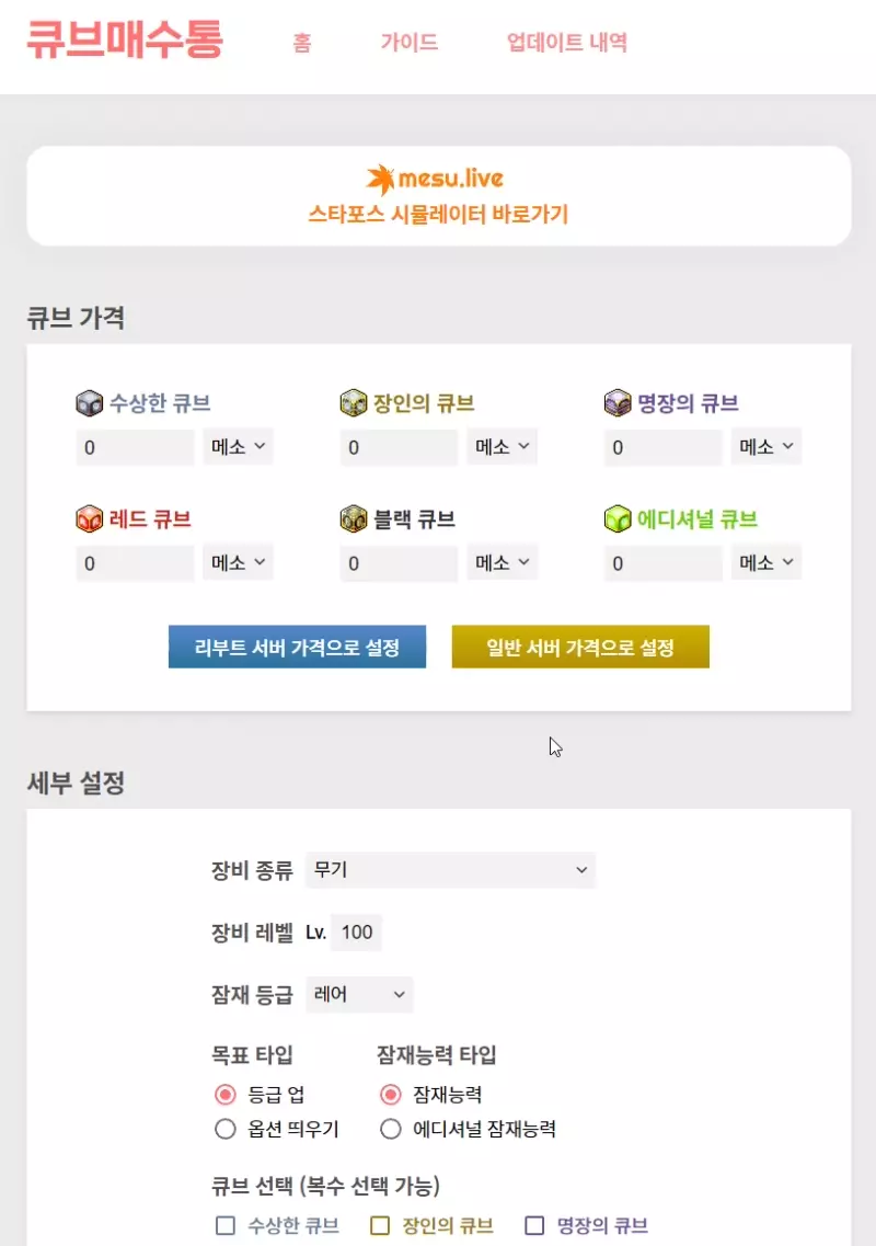 큐브, 스타포스 사이트![]() 큐브 기댓값 계산기(큐브매수통) ![]() 스타포스 시뮬레이터(mesu.live) 둘 모두 https://mesu.live에서 이용하실 수 있습니다. mesu.live 쪽이 올해 3월에 만든 사이트인데 실 사용자가 너무 적어서 재홍보해봐요 ㅠㅠ