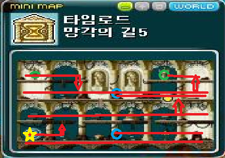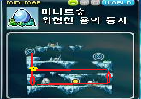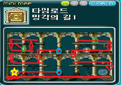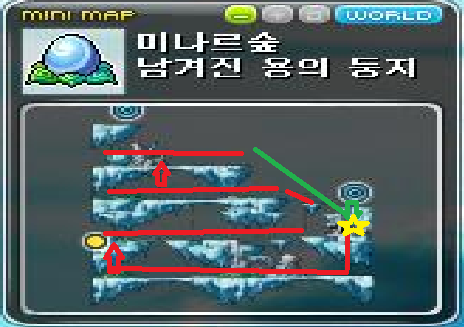 ※ 노란색: 시작포인트 ※하늘색,초록색:텔레포트존 ※빨간색:이동경로 ※참고:1.추억의길,후회의길,망각의길의 구조는비슷하여 똑같은 패턴으로 사냥하시면됩니다. 2.위험한용의둥지 부활하는기억 맵은 동일합니다.
