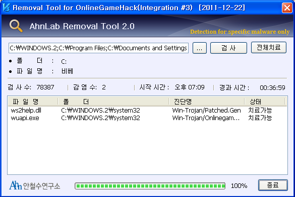 ------------------------------------------------------------------------------------------------------------------ 저는 안철수 연구소 전용백신을 다운받아서 검사를 해보았습니다. 결과는 ws2help.dll, 그리고 wuapi.exe에 감염되었습니다. C:WINDOWS.2system32 이 폴더안에 두 놈이 침투했더군요... 위 글과는 약간 다른 경로지만 말입니다.. ![]() 검사 해보시고 치료를 받으시기 바랍니다. 예방법 예방하기 위해선 플래시와 어도비 리더, 윈도우 업데이트가 필수입니다. 플래시 업데이트 : http://get.adobe.com/kr/flashplayer/ 어도비 리더 업데이트 : http://get.adobe.com/kr/reader/ 윈도우 업데이트 : http://www.update.microsoft.com/windowsupdate/v6/thanks.aspx?Inko&&thankspage=5