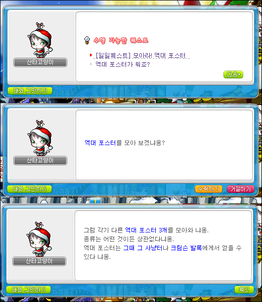 4~10주년 포스터를 그때 그 사냥터 또는 크림슨발록을 통해 모을 수 있다고 합니다. 그렇게 얻은 포스터 3개를 가져다 달라는 일일퀘스트 입니다.