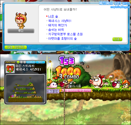 ▲ 루디를 통해 예전에 인기있던(?) 유저들이 많이 추억하던(?) 그때 그 사냥터에 가보실 수 있는데요! 또한 일일퀘스트도 있으니 참여해보시는걸 강추합니다. 헤네시스 사냥터1 ㅠㅠㅠ